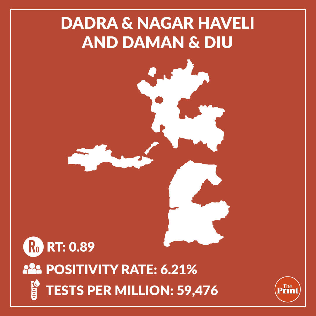 The union territories of Dadra and Nagar Haveli and Daman and Diu have recorded the lowest Rt value in India, at 0.89. Their combined positivity rate stands at 6.21 per cent and the tests-per-million figure is 59,476. The total number of cases recorded in the union territories are 520, of which 209 are active.