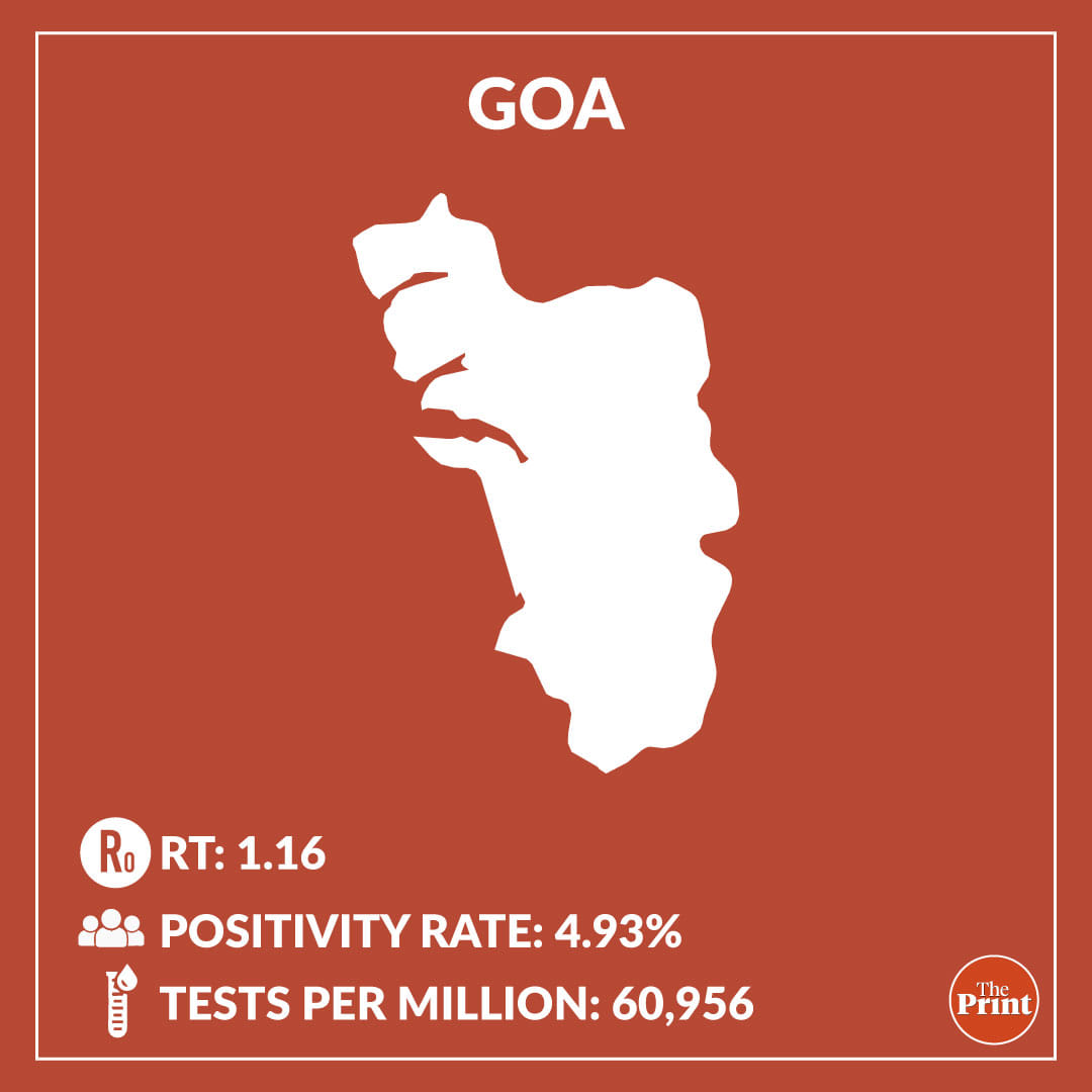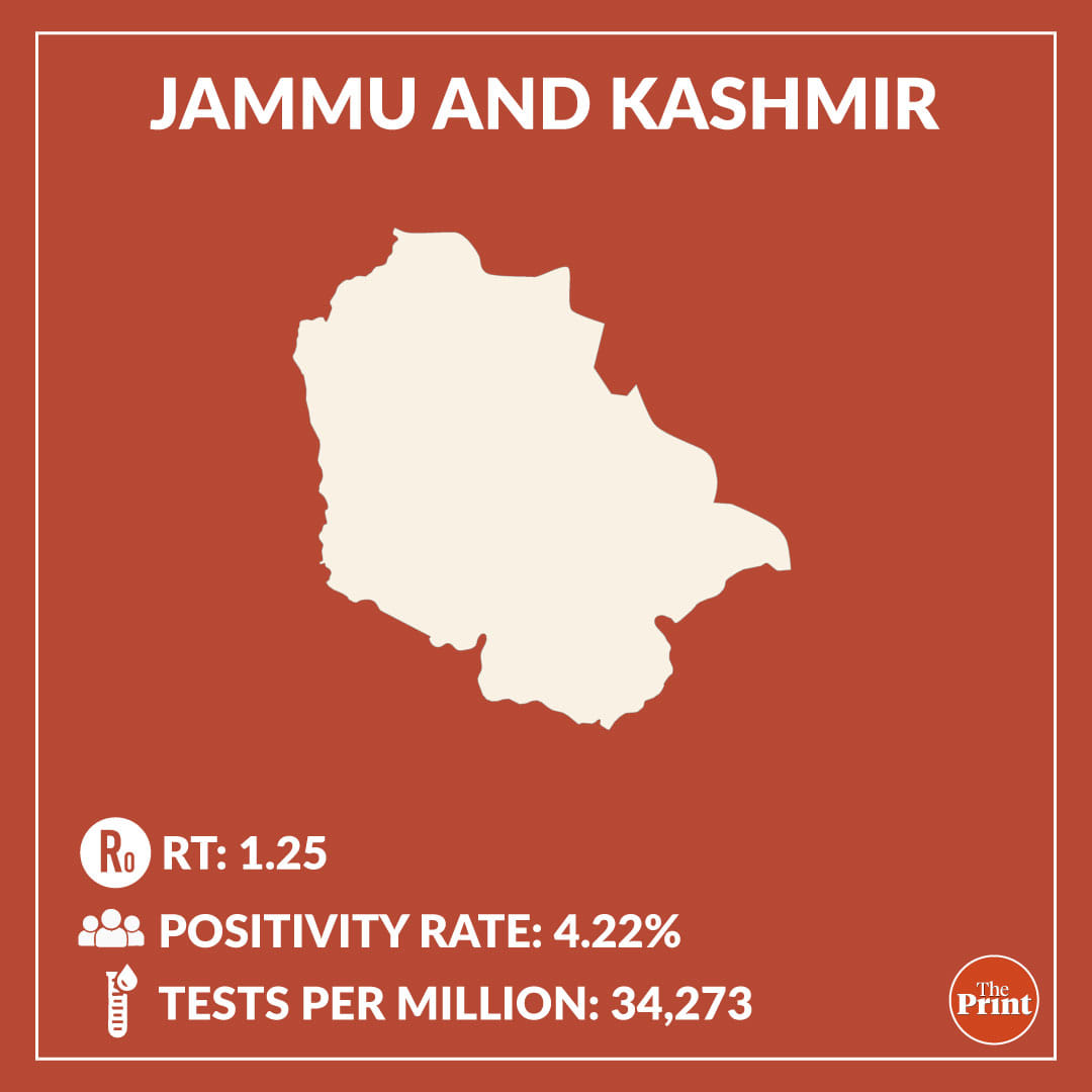 Jammu and Kashmir has an Rt value of 1.25 and a positivity rate of 4.22 per cent. It has conducted a relatively high 34,273 tests per million. The UT is open for tourists, but only air travellers are allowed so far.