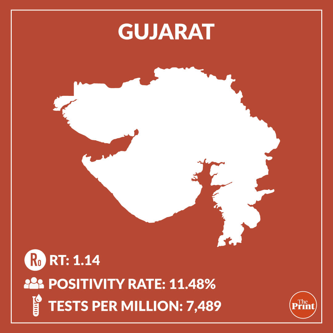 Gujarat has the highest case fatality rate in the country, at 6.18 per cent, almost double the country’s average case fatality rate of 3.86 per cent. The state has recorded an Rt value of 1.14, conducted 7,489 tests per million, and its high positivity rate is a high 11.48 per cent.