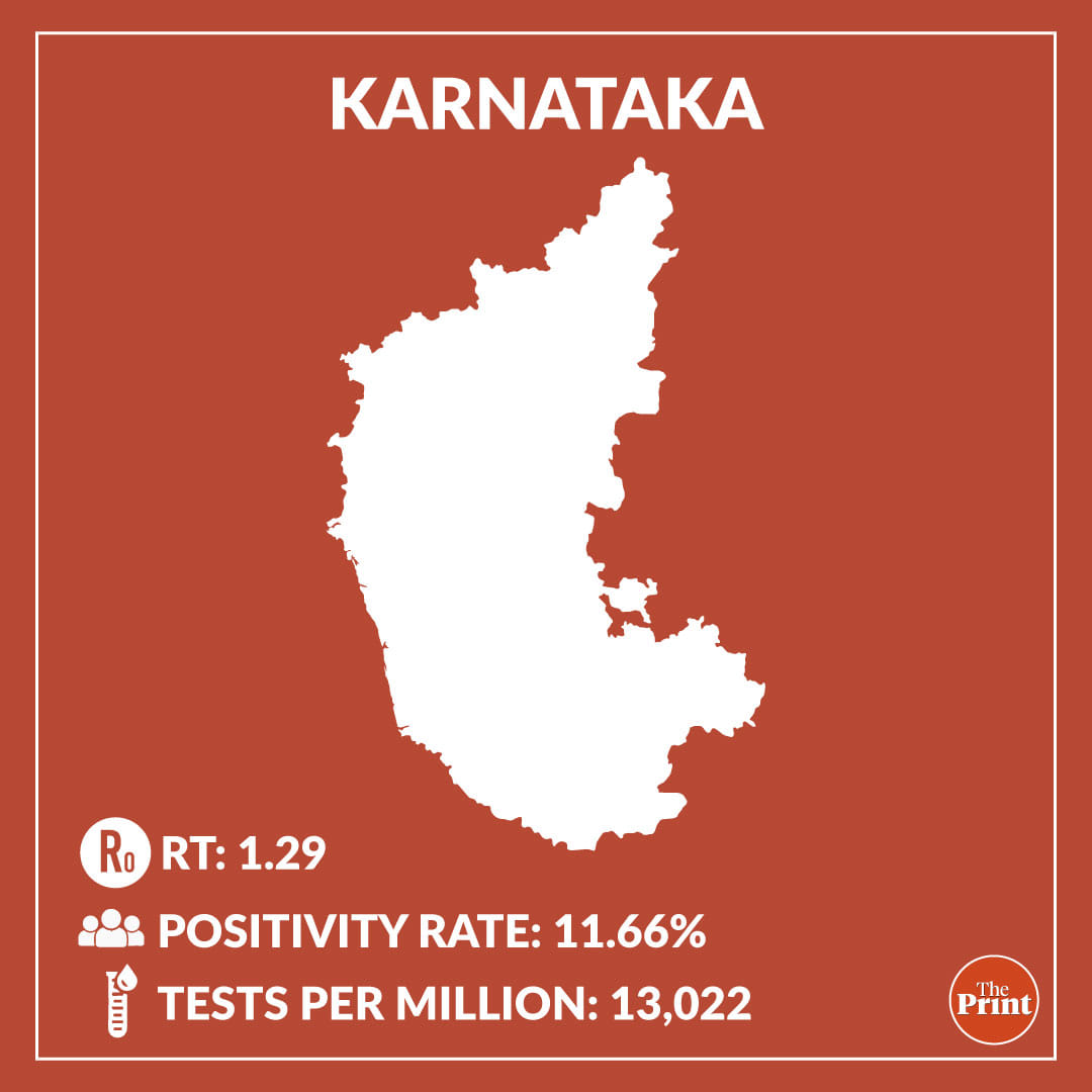 Karnataka has a high Rt value of 1.29 and has the third highest positivity rate in the country of 11.66 per cent. The state has conducted 13,022 tests per million so far. On Tuesday, Karnataka overtook Gujarat to become the state with fourth highest caseload of Covid-19 infections.