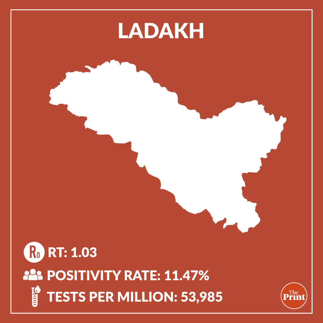 Ladakh recorded the highest recovery rate in India on 13 July with 85.45 per cent, and its Rt value is a little above 1, at 1.03. With 53,985 tests per million, the UT has recorded a high positivity rate of 11.47 per cent.