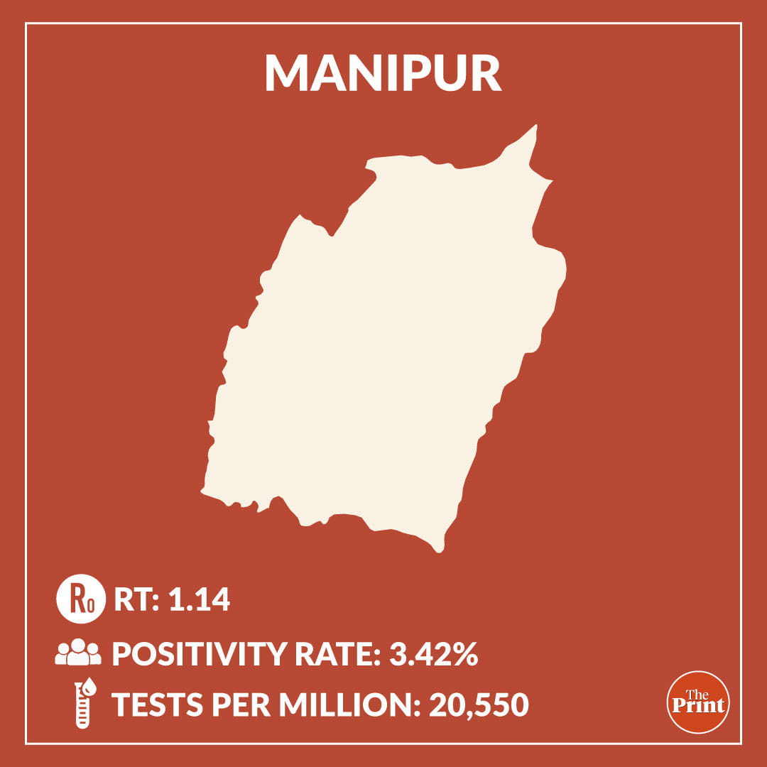 With an Rt value of 1.14, Manipur has recorded a positivity rate of 3.42 per cent. The state reported 17 new Covid-19 cases Tuesday. It has conducted 20,550 tests per million so far.