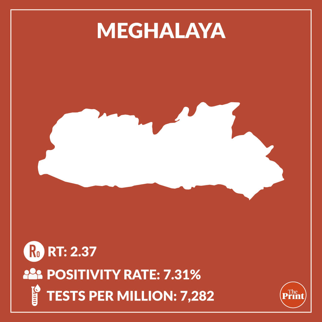 Meghalaya has recorded the highest Rt value in the country, at 2.37. This is more than double the average all-India Rt value of 1.15. Meghalaya recorded a test positivity rate of 7.31 per cent and conducted 7,282 tests per million. The state government Wednesday decided to close its borders form 21 July to 31 July. Forty-six people have recovered from the disease and two have died.