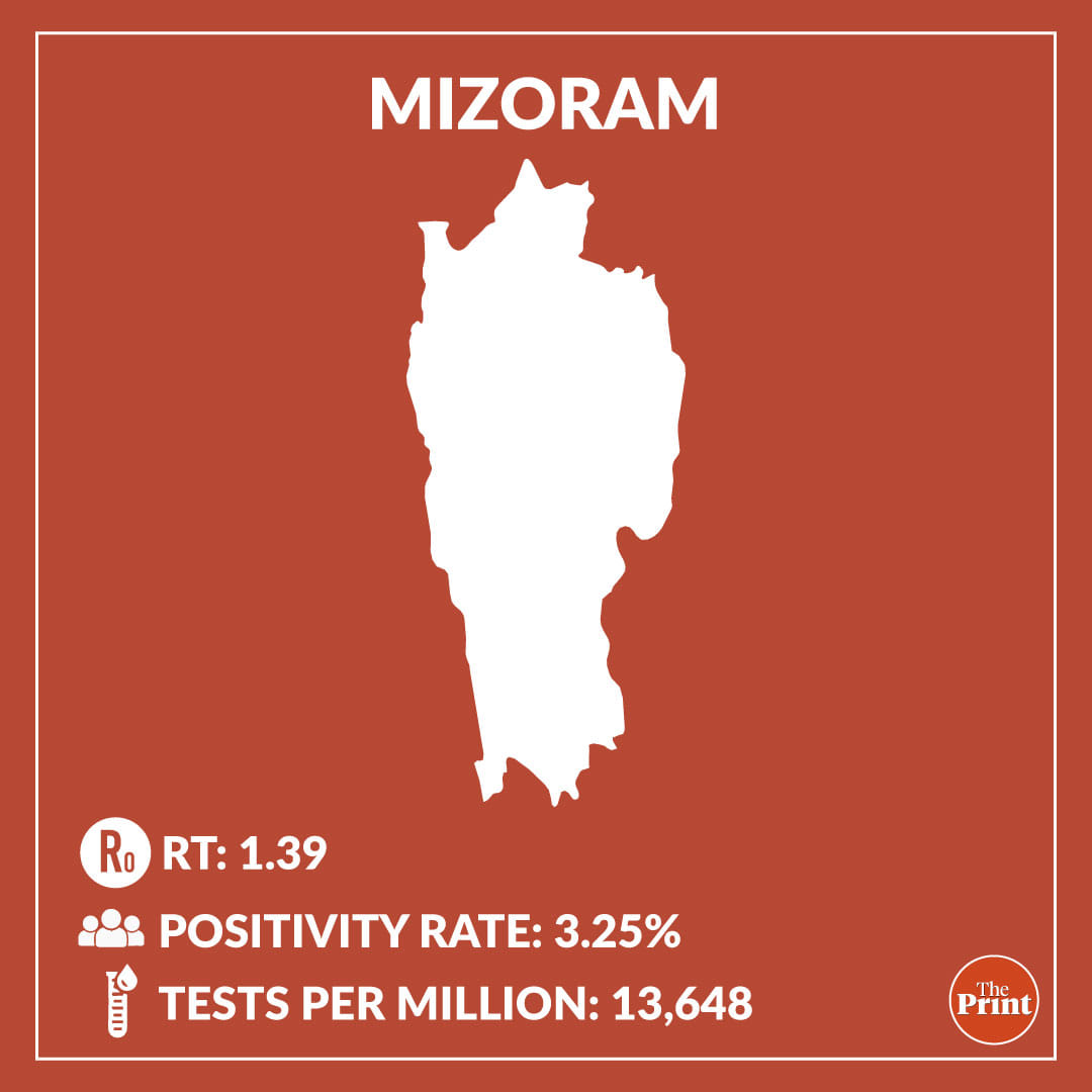Mizoram has an Rt value of 1.39 and a relatively low positivity rate of 3.25 per cent. The state has conducted 13,648 cases per million. On Wednesday, the state reported five new cases taking the total tally to 238.