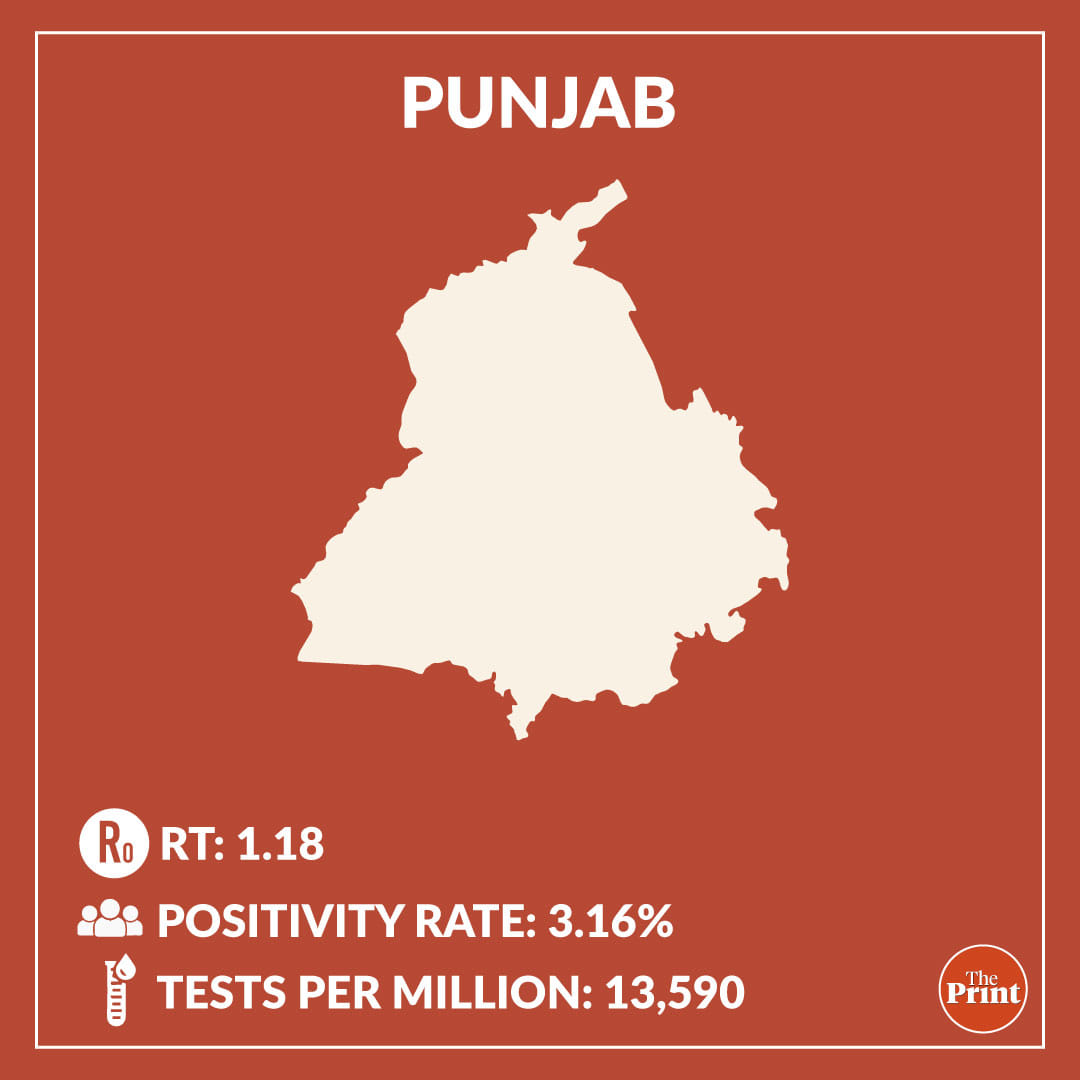 Punjab has recorded an Rt value of 1.18. The state has a relatively low positivity rate of 3.16 per cent and has conducted 13,590 tests per million. Punjab was the first state in India to impose a Covid-related curfew on 23 March 2020.