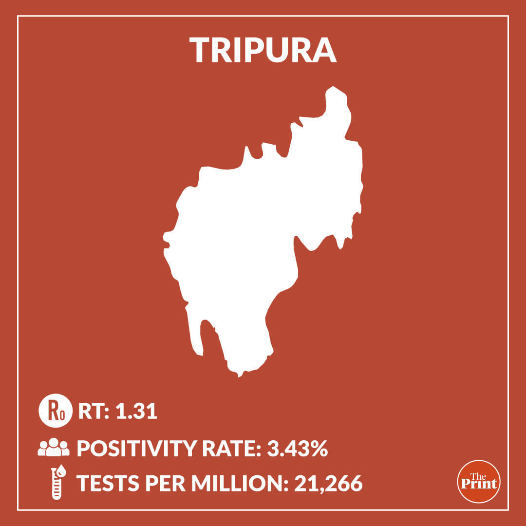 Tripura’s Rt value was recorded at 1.31 and positivity rate at 3.43 per cent. It has carried out 21,266 tests per million. The state Tuesday announced a total lockdown in areas bordering Bangladesh, after that country witnessed a spike in cases.
