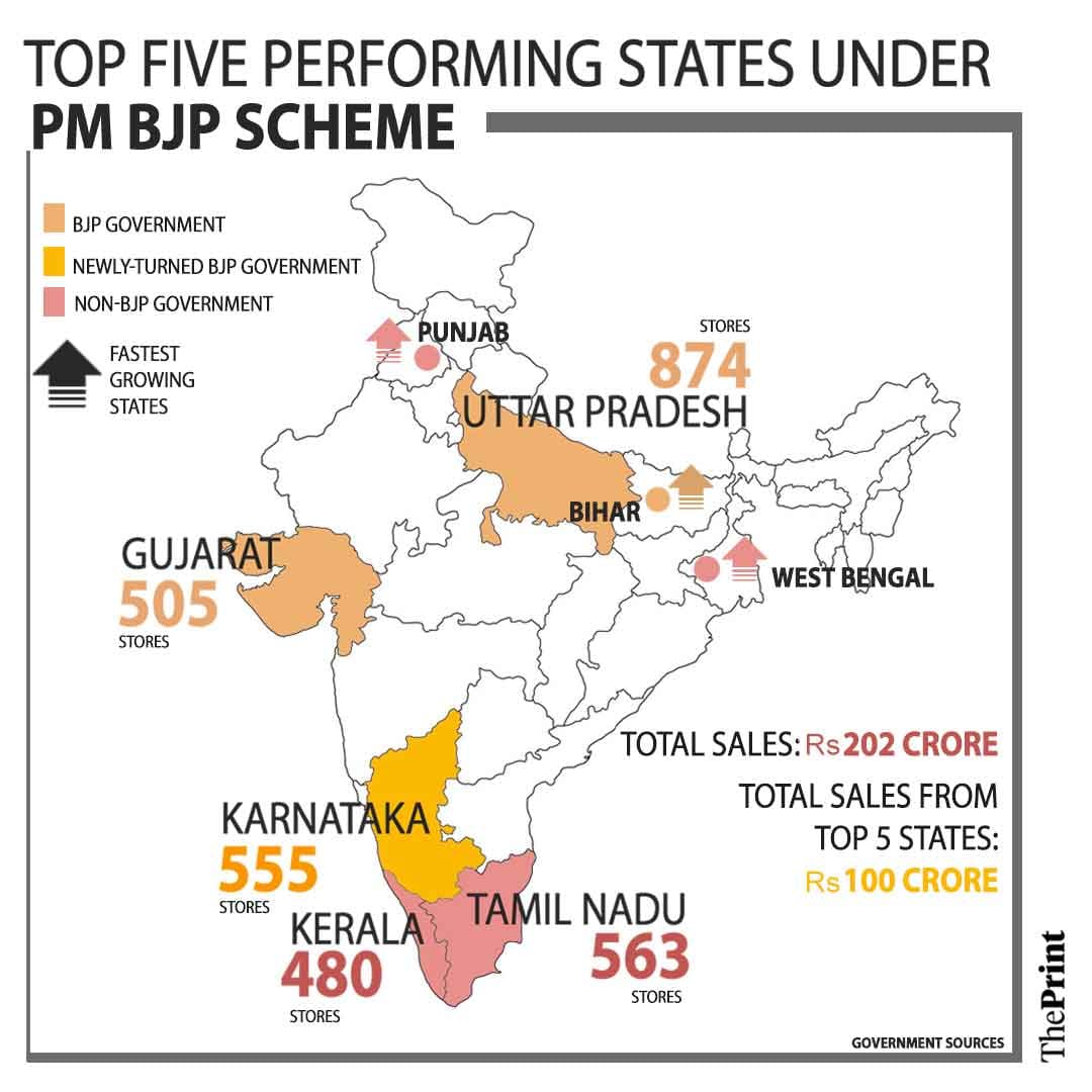 New Delhi: A popular cheap medicines scheme of the Narendra Modi government — which comes with some surrogate branding for the BJP — has met with more success in non-BJP ruled states, data accessed by ThePrint shows.