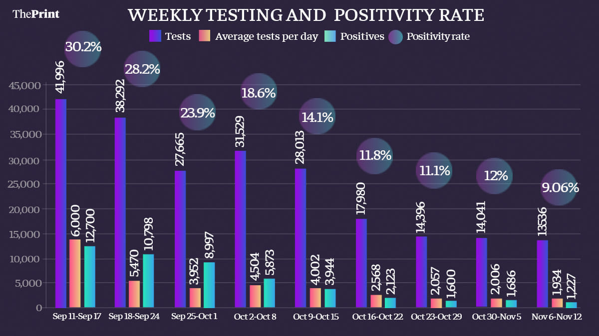 Along with a drop in the number of tests, the positivity rate too has steadily declined. The city had recorded a positivity rate as high as 30.2 per cent two months ago in the 11-17 September week.