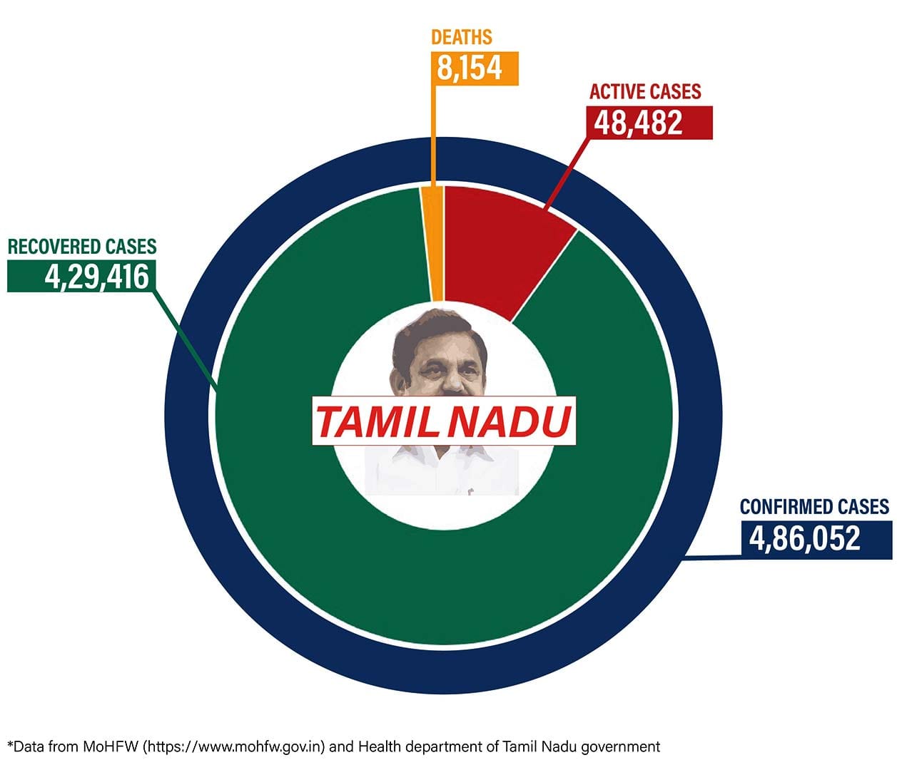 In Tamil Nadu, less than 49,000 of the 4,86,052 cases are active. This shows that despite the high numbers, the state has managed to stabilise the pandemic to some extent. In the last 24 hours, 5,528 cases and 64 deaths were reported.