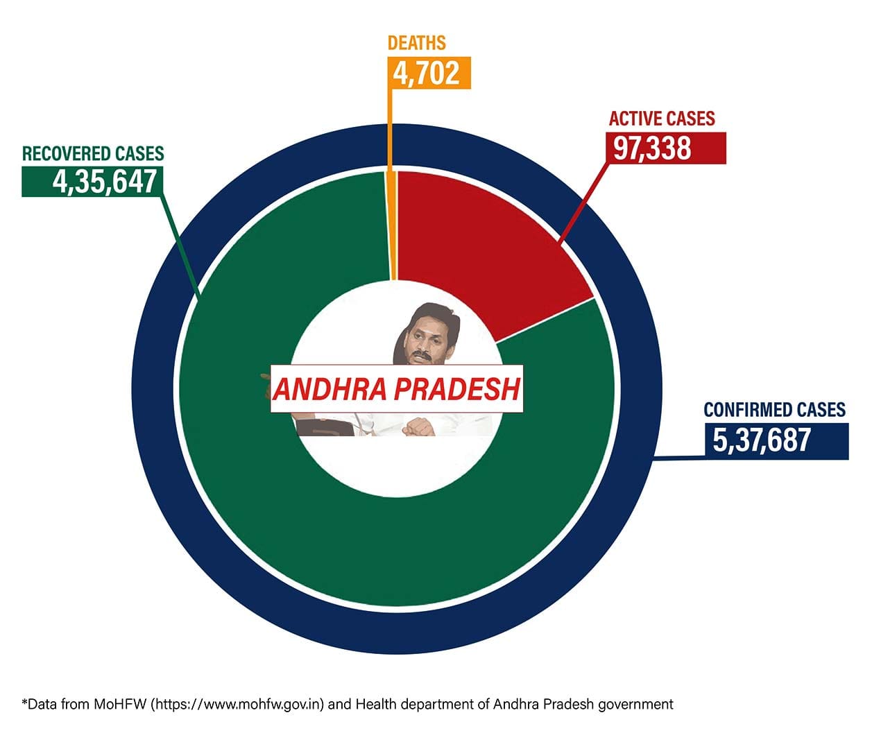 Andhra Pradesh has so far recorded 5,37,637 cases — of which 10,125 cases and 68 deaths were reported in the last 24 hours. The state’s case fatality rate is 0.87 per cent and the doubling time is close to 35 days.