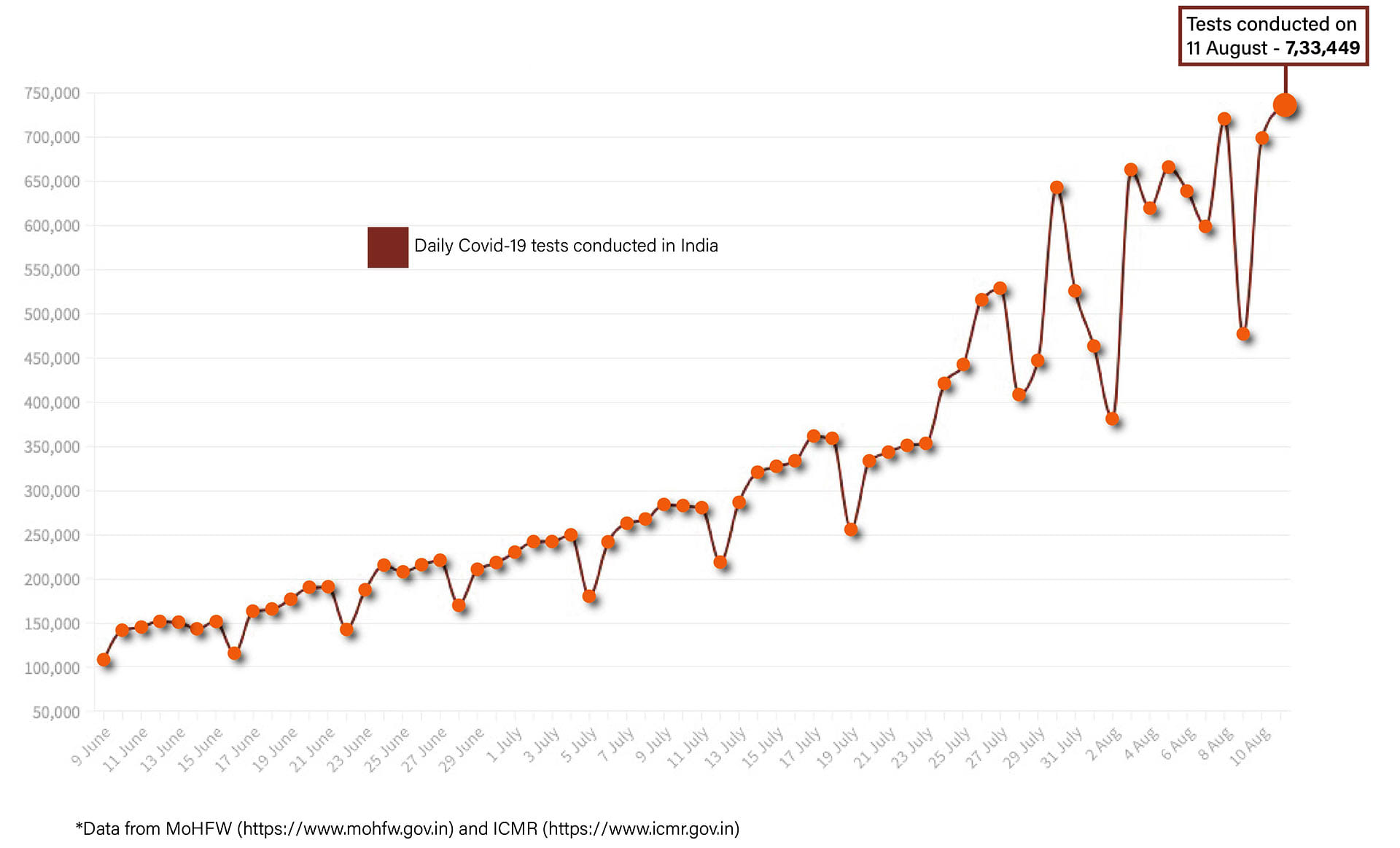 Yet another day of high testing has happened. In the last 24 hours, India tested 7,33,449 samples, taking the total to 2,60,15,297. India, however, is among the lowest testing countries in the world.