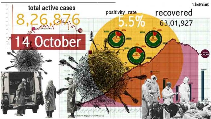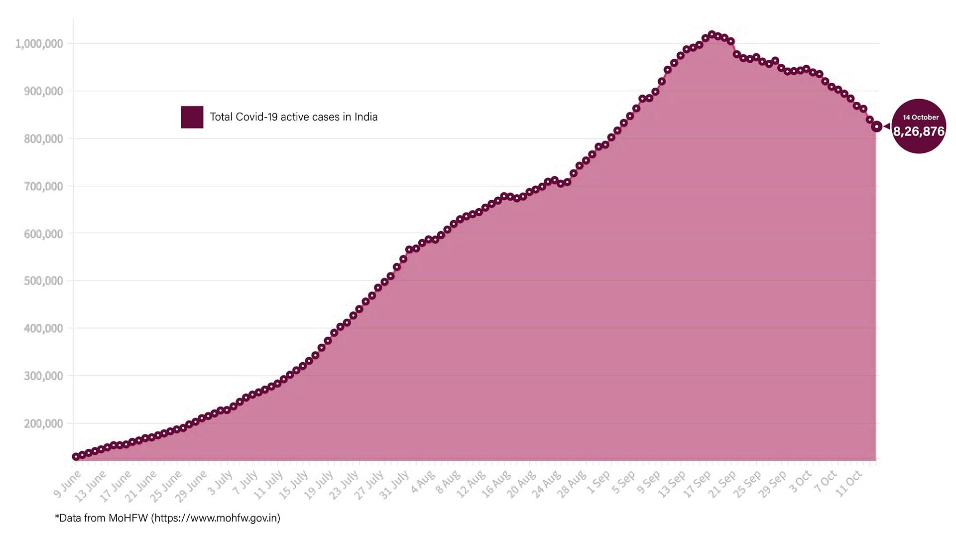 The number of active cases saw a significant dip Wednesday, reducing to 8,26,876. The active case count in India has been on a decline for over three weeks now. Of the new cases, 77 per cent are from 10 states and Union Territories. Kerala has outnumbered Maharashtra with the highest number of new reported cases.