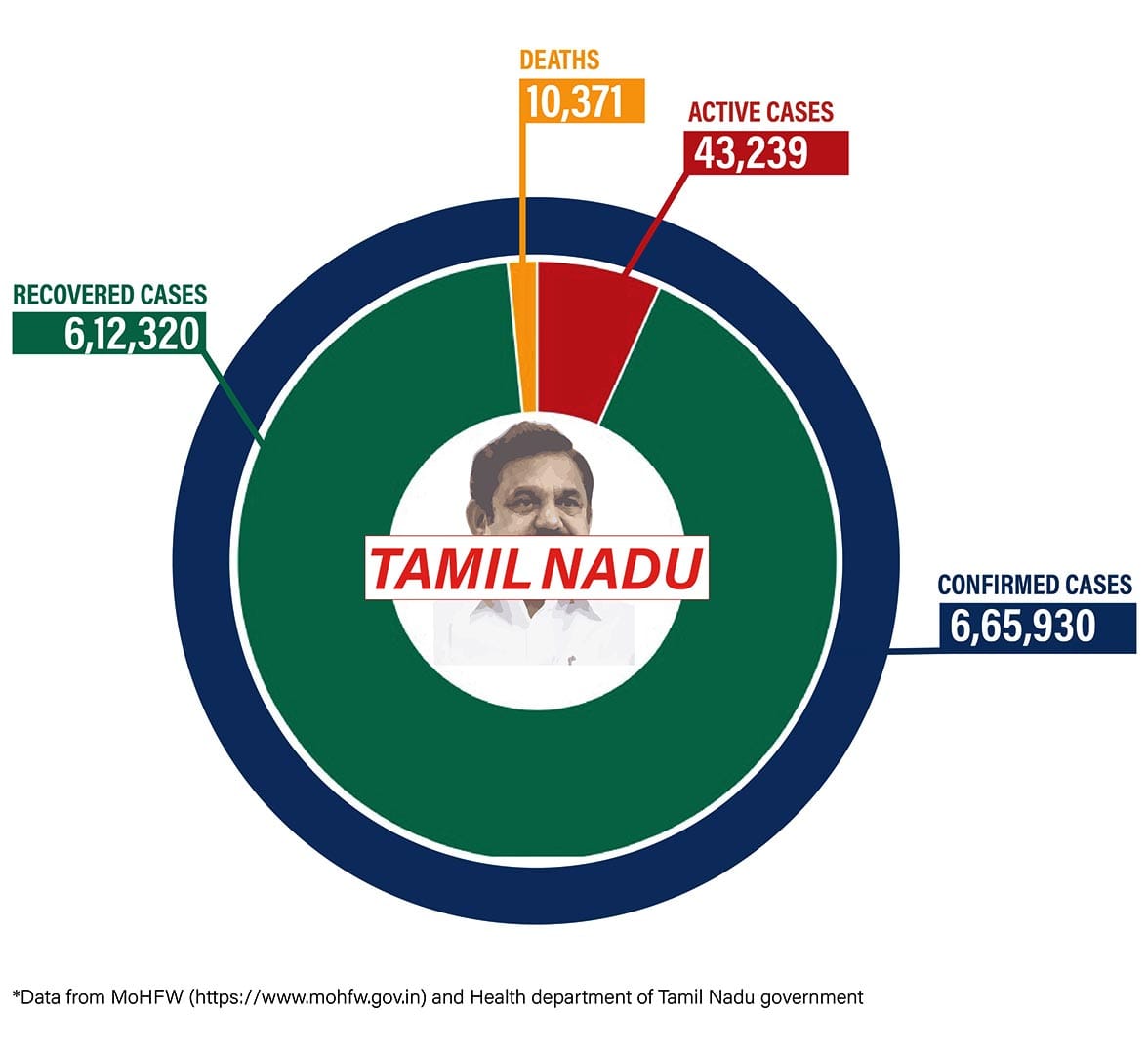 Tamil Nadu has 43,239 active Covid-19 cases in total, with 4,666 new cases and 57 deaths recorded in the last 24 hours. The number of confirmed Covid-19 cases in Tamil Nadu so far is 6,65,930 and 10,371 people have died in the state.