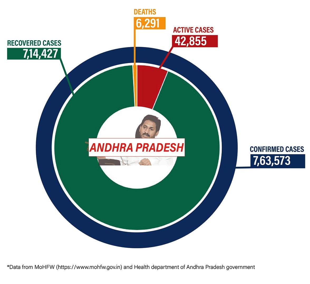 Andhra Pradesh reported 4,622 new cases in the last 24 hours, bringing the total number of cases to 7,63,573. With 35 Covid-19 deaths in the last 24 hours, the state’s death toll now stands at 6,291.