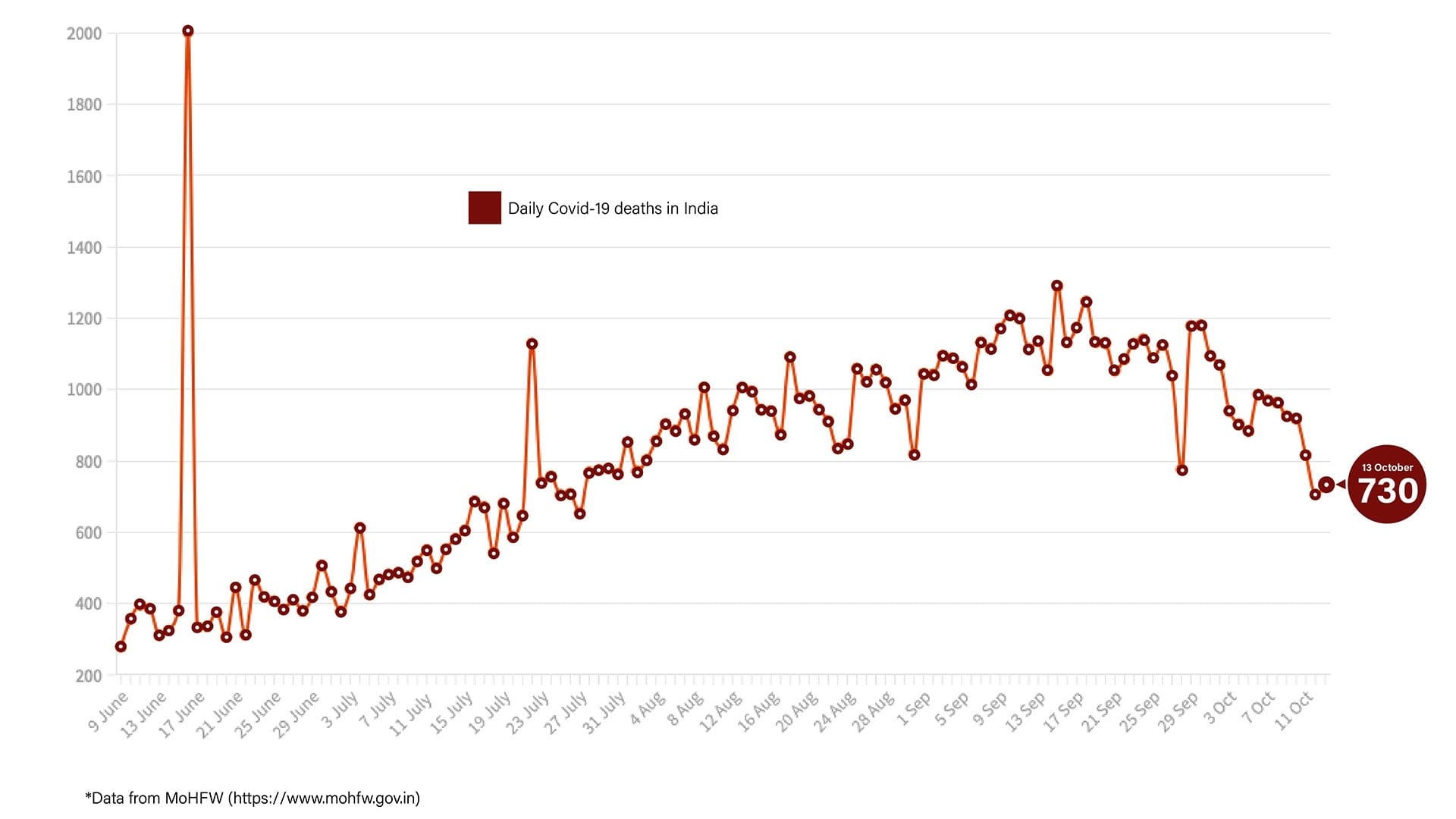 In the last 24 hours, India has registered 730 Covid deaths, a slight increase from Tuesday. The number of deaths per day has been declining for over a week, and Tuesday recorded the lowest number of deaths in 24 hours (706) since 27 July.
