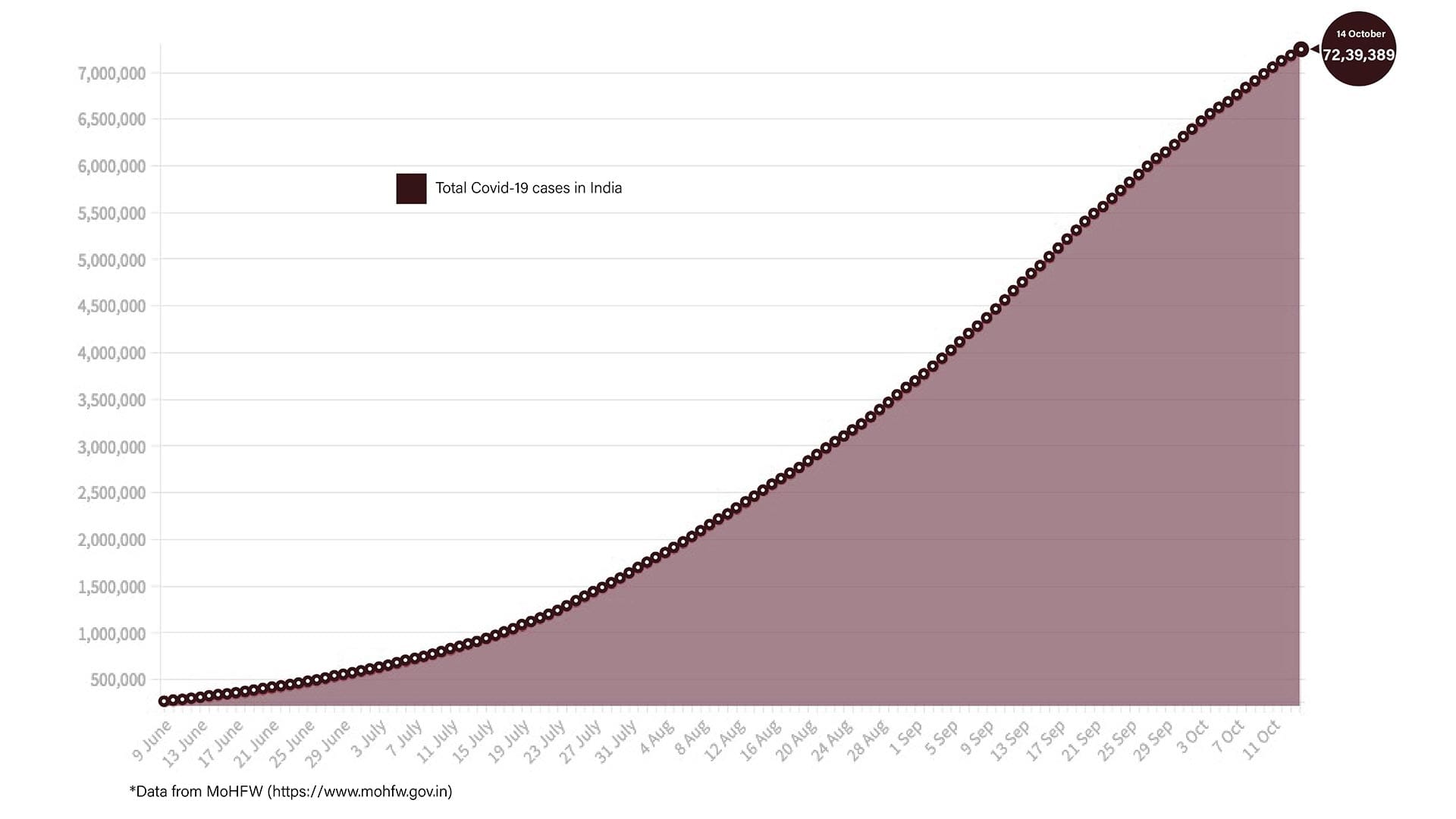A total of 74,632 Covid-19 patients have been discharged in the last 24 hours, which brings the recovery rate to about 87.05 per cent, a slight increase from 86.78 per cent yesterday. Of these, 79 per cent new recovered cases were concentrated in 10 states and Union Territories — Maharashtra, Karnataka, Kerala, Andhra Pradesh, Tamil Nadu, Uttar Pradesh, West Bengal, Chhattisgarh, Odisha, and Delhi.