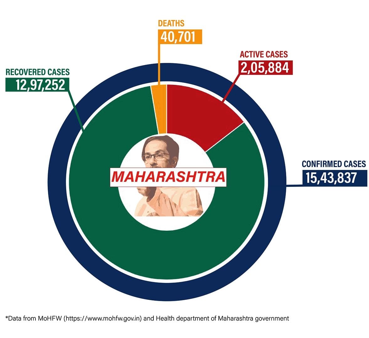 In Maharashtra, the total number of Covid-19 cases stand at 15,43,837 with 8,522 new cases registered in the last 24 hours. The state has seen 40,701 deaths so far, with 187 deaths in the last 24 hours. The state has the highest number of active cases at 2,05,884.