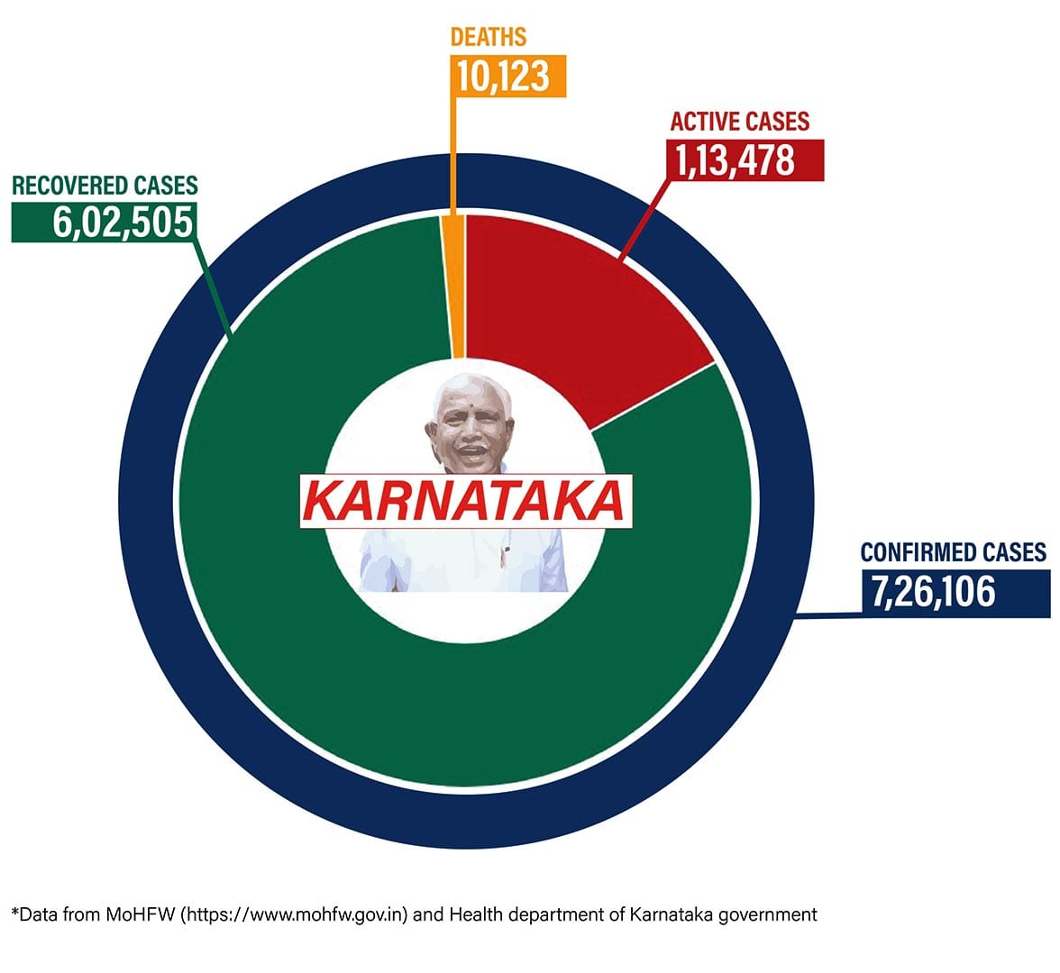Karnataka is the state with the second highest burden of active cases. Over the last 24 hours, the state saw 8,191 fresh cases, bringing the total number of cases in the state to 7,26,106. Of these, 1,13,478 are active cases. As many as 87 people have died from Covid in the last 24 hours in Karnataka, bringing the total death toll to 10,123.