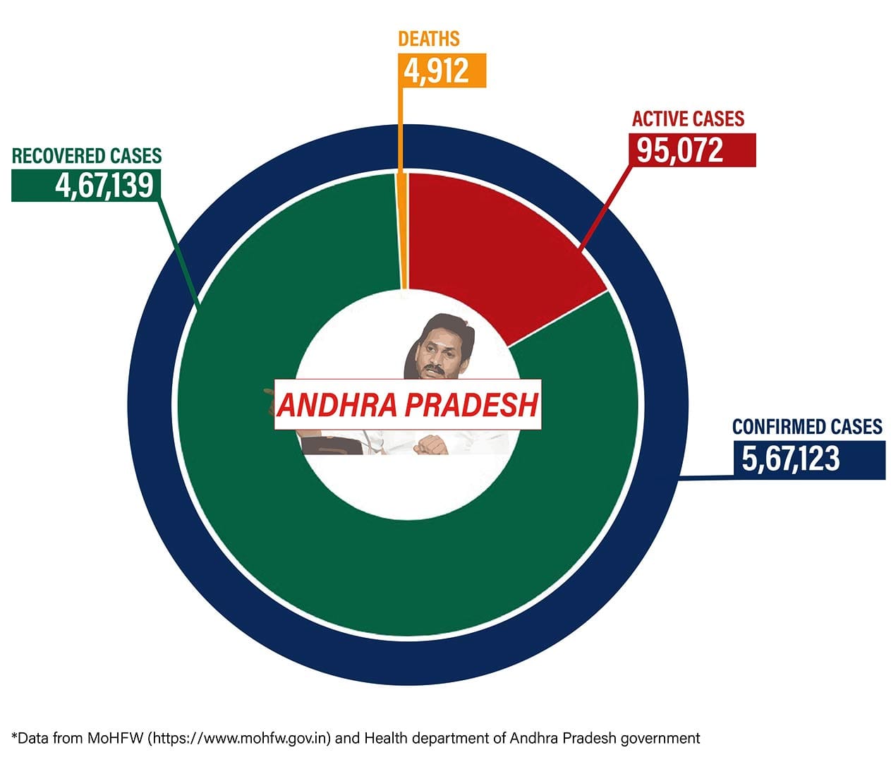 Andhra Pradesh recorded 9,536 cases and 66 deaths in the last 24 hours. It has so far, seen 5.67,123 cases with a case fatality rate of 0.87 per cent.