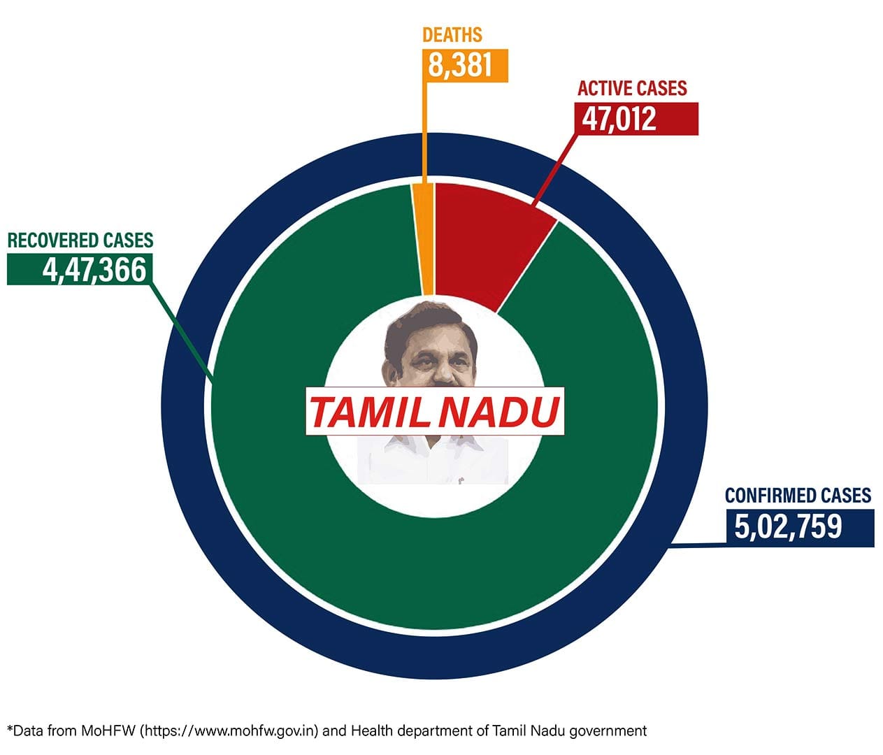Of Tamil Nadu’s 5,02,759 total cases — 47,012 are active cases. In the last 24 hours, the state has reported 5,693 cases and the doubling time is now close to 62 days. The case fatality rate is the same as the national average.