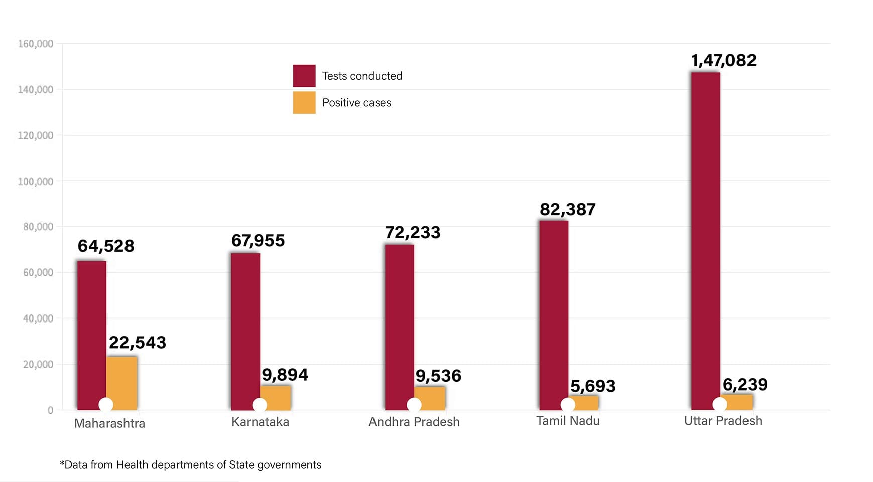 The tests in Maharashtra dipped again and Tamil Nadu, which conducted 82,387 tests in the last 24 hours, is now second to Uttar Pradesh’s 1,47,082 daily tests.