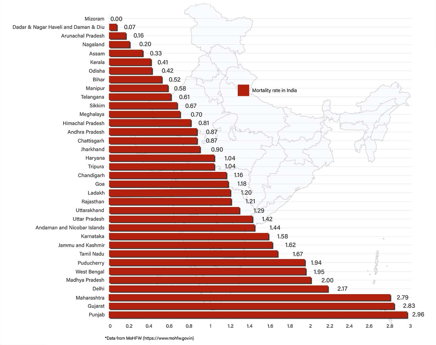 Punjab remains at the bottom of the list in terms of case fatality rate even as Maharashtra, which has seen the most deaths so far, is number 3 on the list. Eight states are above the national average of 1.67 per cent.