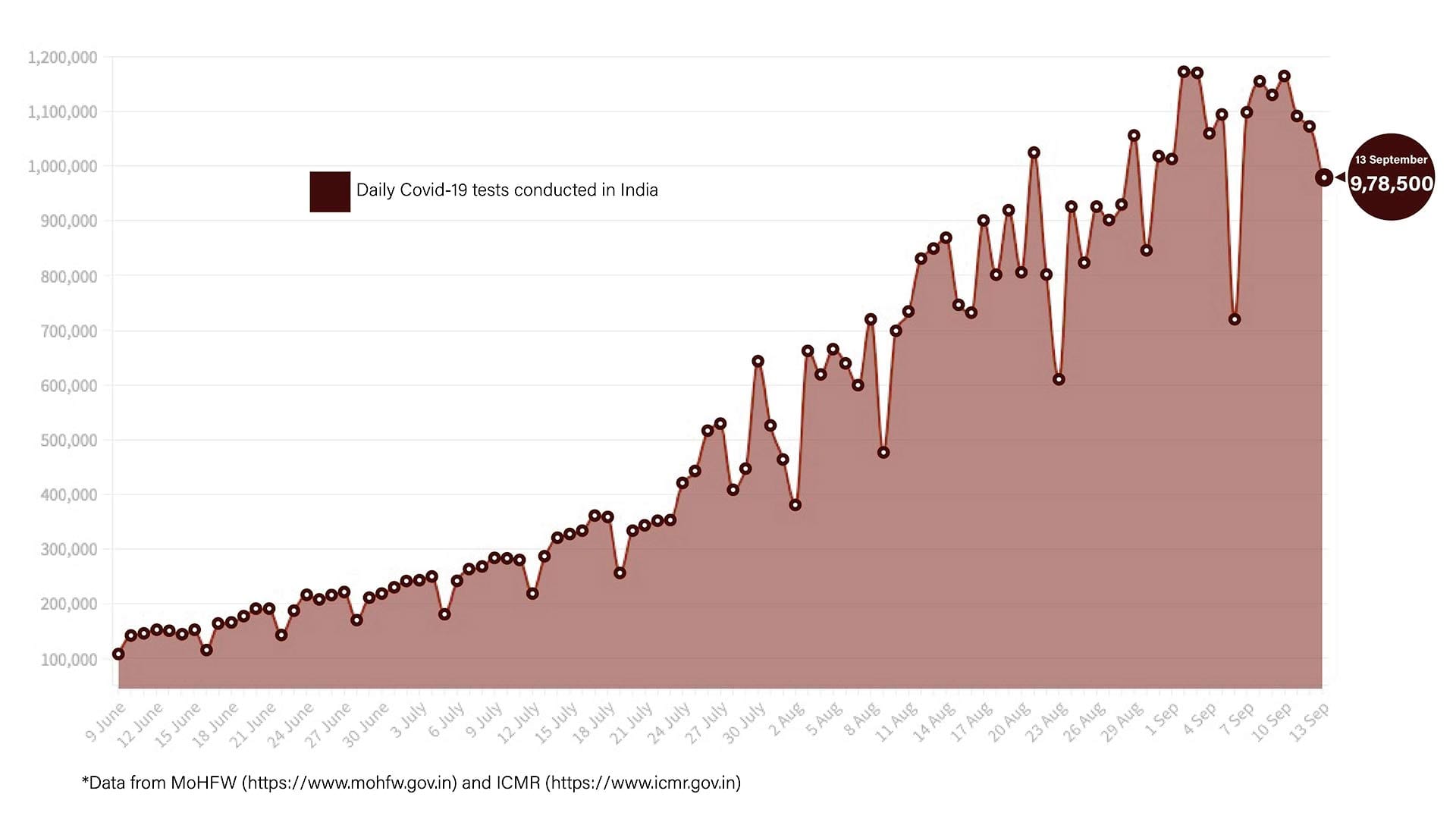 As the tests fell below the million mark, for the first time in a week in India, the positivity rate inched close to 10 per cent again.