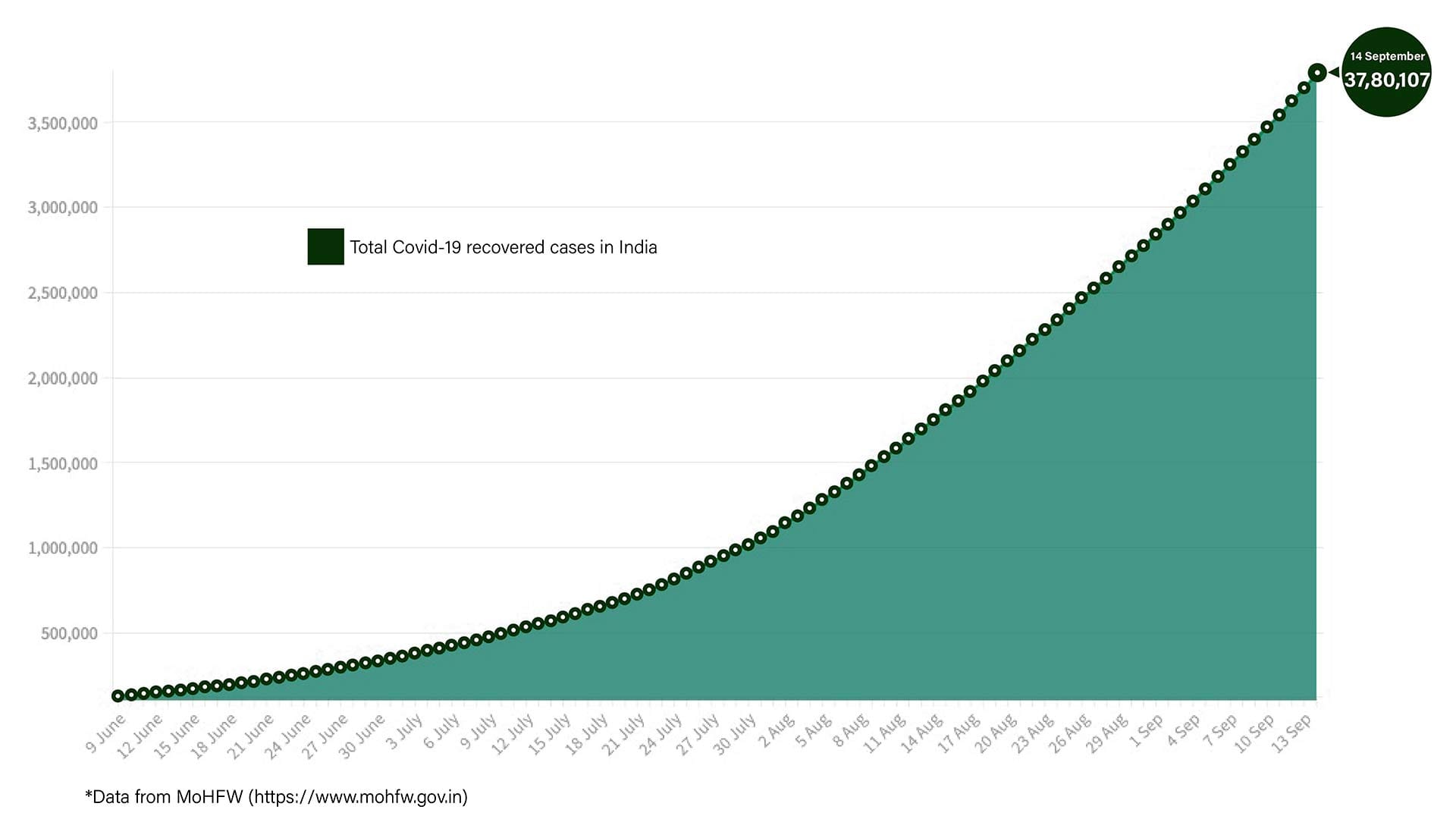 In the last 24 hours, 77,512 patients have been discharged. The total recovered cases stands at 37,80,107. The gap between recovered cases and active cases is consistently increasing and touched nearly 28 lakh (27,93,509) Sunday.