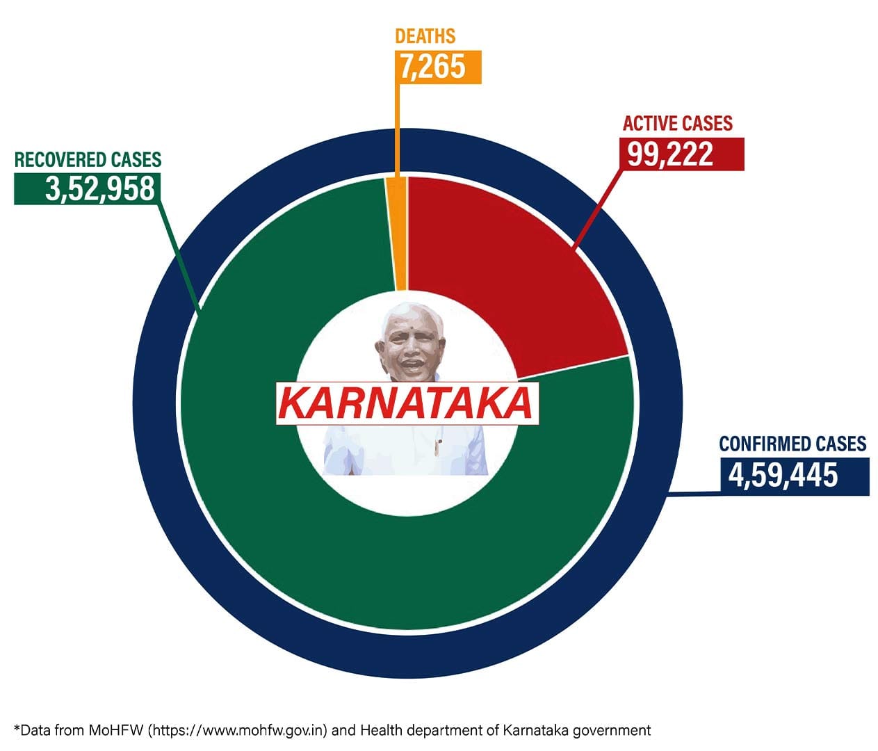 In Karnataka, 99,203 cases are active of the total 4,59,445 cases. In the last 24 hours, the state reported 9,894 cases and 104 deaths with a case fatality rate of 1.59 per cent.