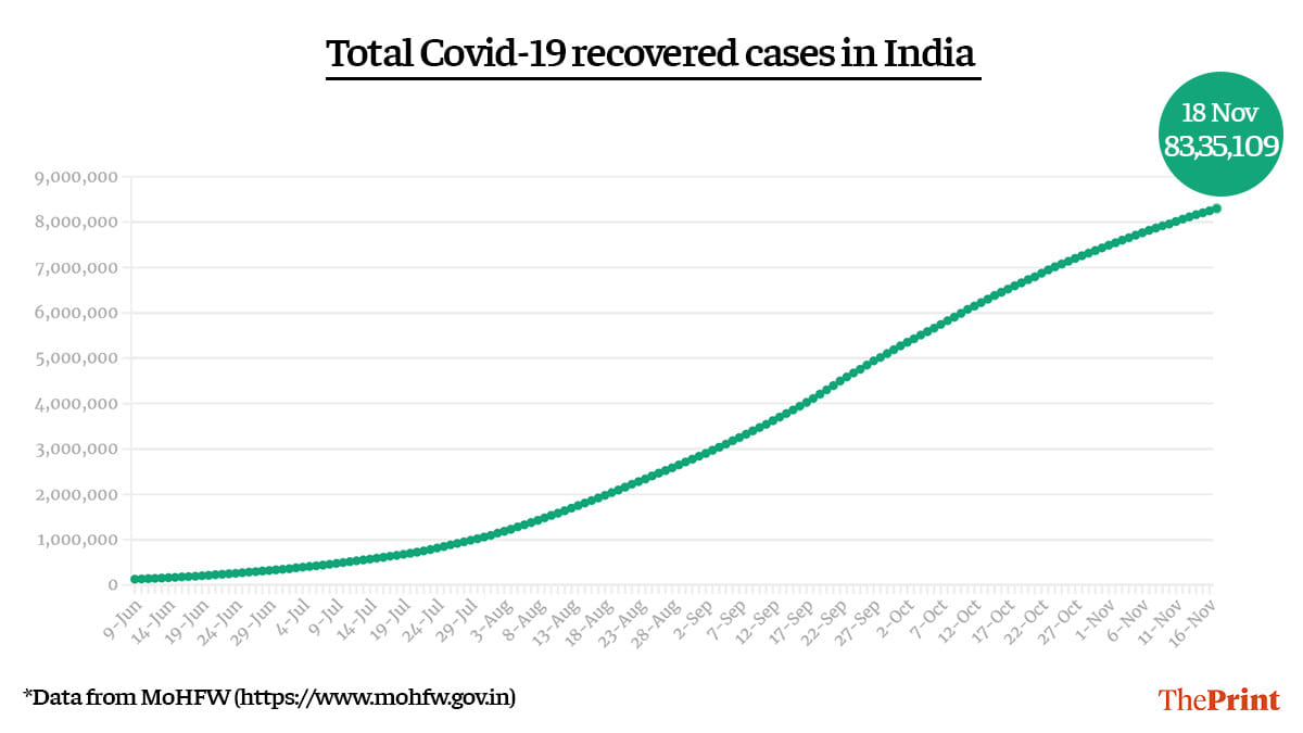 About 44,739 Covid-19 patients were discharged in the last 24 hours across the country. Since the beginning of the pandemic, 83,35,109 patients have recovered in India.