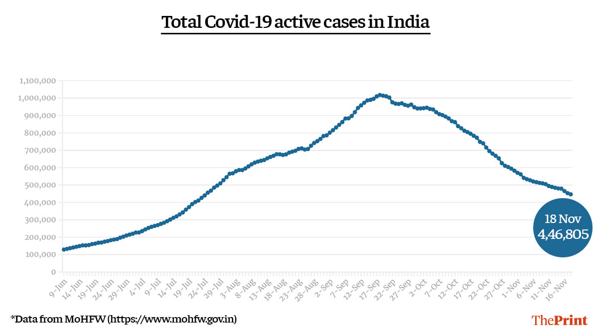 The number of total active cases in India fell to 4,46,805 Wednesday. This accounts for just over 5 per cent of the total coronavirus cases detected in the country since the beginning of the pandemic. The last time active cases were this low was on 24 July.