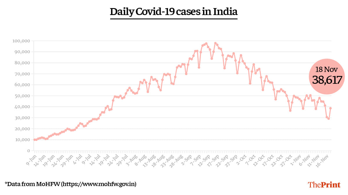 New Delhi: As testing increased to over 9 lakh for the first time since the Diwali weekend, the number of new cases across the country also saw a rise, with 38,617 cases recorded in the last 24 hours. This also led to a rise in the test positivity rate.