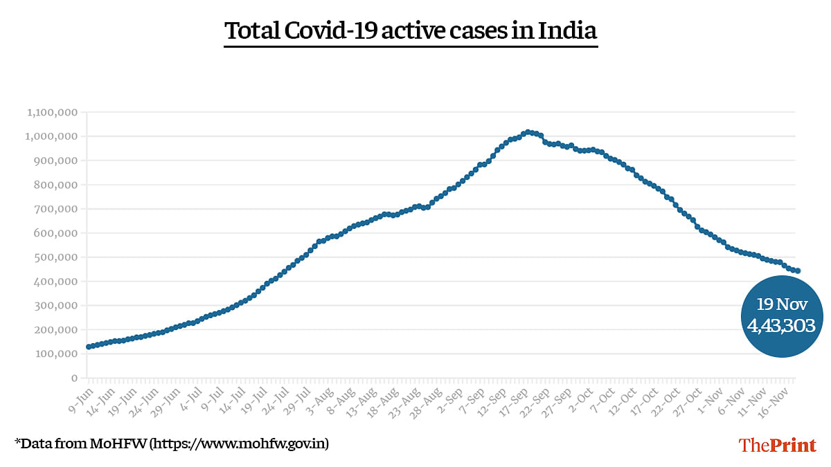 As recoveries continue to outnumber daily cases, the total active caseload in India fell to 4,43,303 — which is 4.95 per cent of the total cases detected in the country since the beginning of the pandemic.