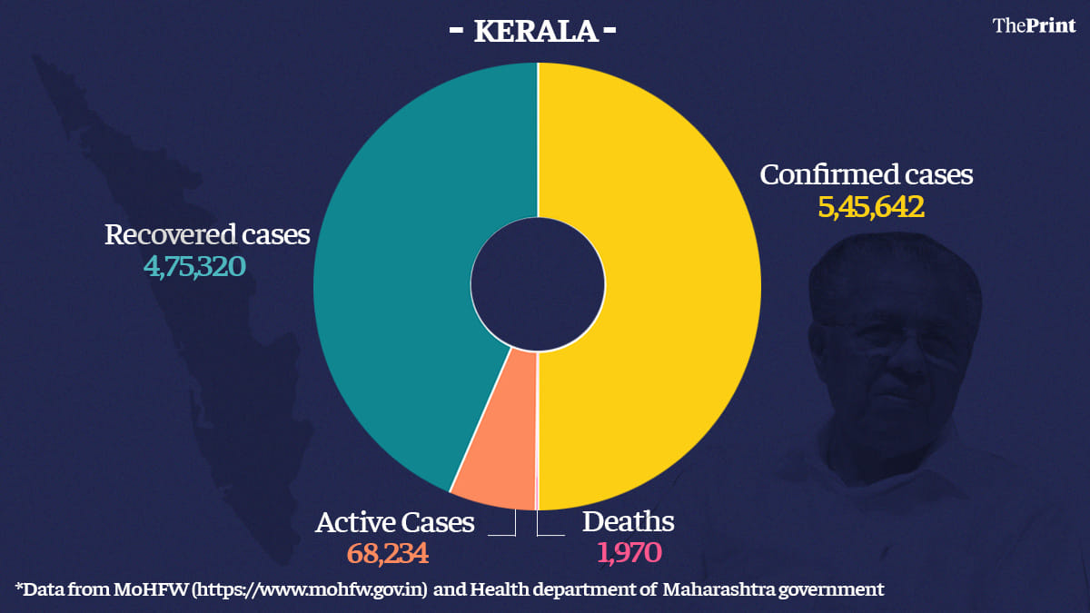 Kerala accounts for 15.40 per cent of India’s total active case load. The state has recorded 68,234 active cases and 1,970 deaths so far. The total number of cases in the state stands at 5,45,642.