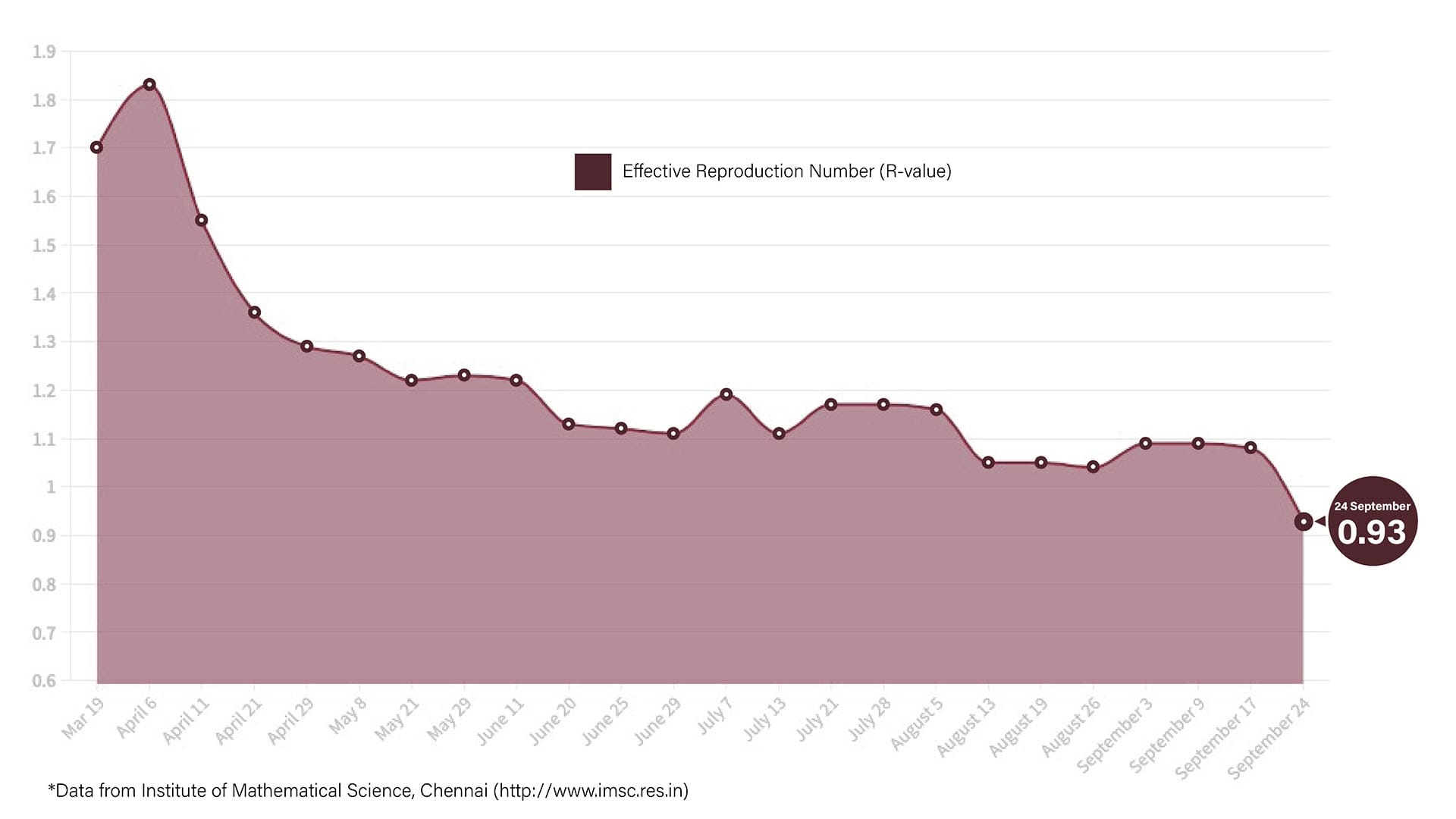 For the first time since the beginning of the pandemic, the R value in India, which measures how many people one infected person is likely to spread a disease to, has fallen below 1. While this is good news, one worrying factor is that the value was recorded in the past week, when the testing numbers were low.