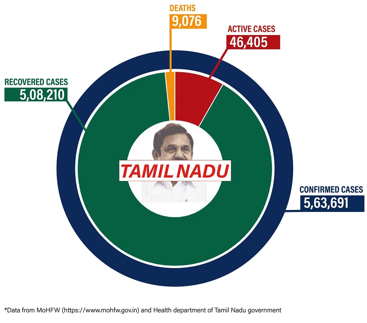 Tamil Nadu’s total number of active cases has been a little over 46,000 for a few days now. This is good news at this stage of the pandemic, especially when all other states are recording exponential growths in active cases. The state has a total of 5,63,691 cases.