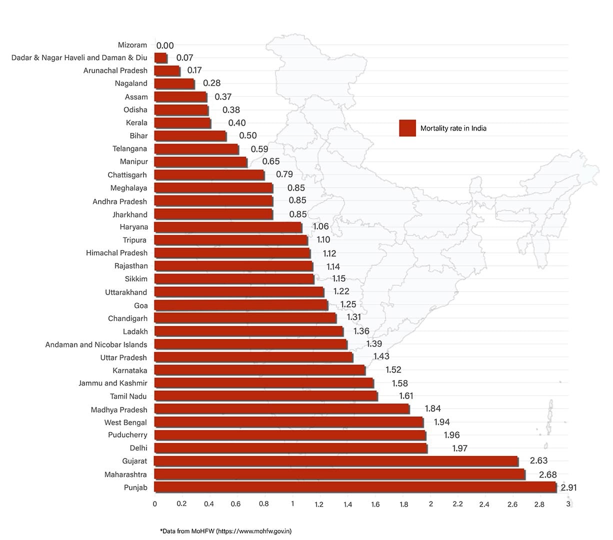 The case fatality rates of about eight states and Union Territories — Punjab, Maharashtra, Gujarat, Delhi, Puducherry, West Bengal, Madhya Pradesh and Tamil Nadu — are still above the national average of 1.59 per cent. States with a CFR of less than 1 include big states like Assam, Odisha, Kerala, Bihar and Andhra Pradesh.