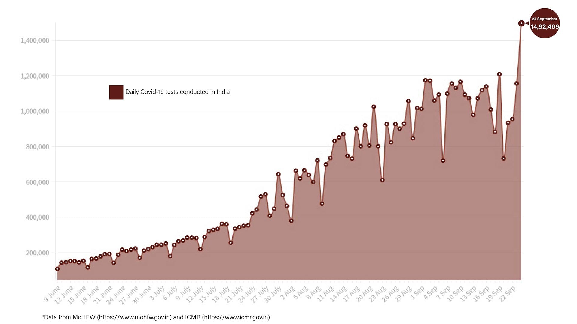 New Delhi: After being under fire for the decrease in week-on-week testing numbers, the Indian Council of Medical Research (ICMR), the country’s top medical research body, registered an all-time high of almost 15 lakh tests in the past 24 hours.