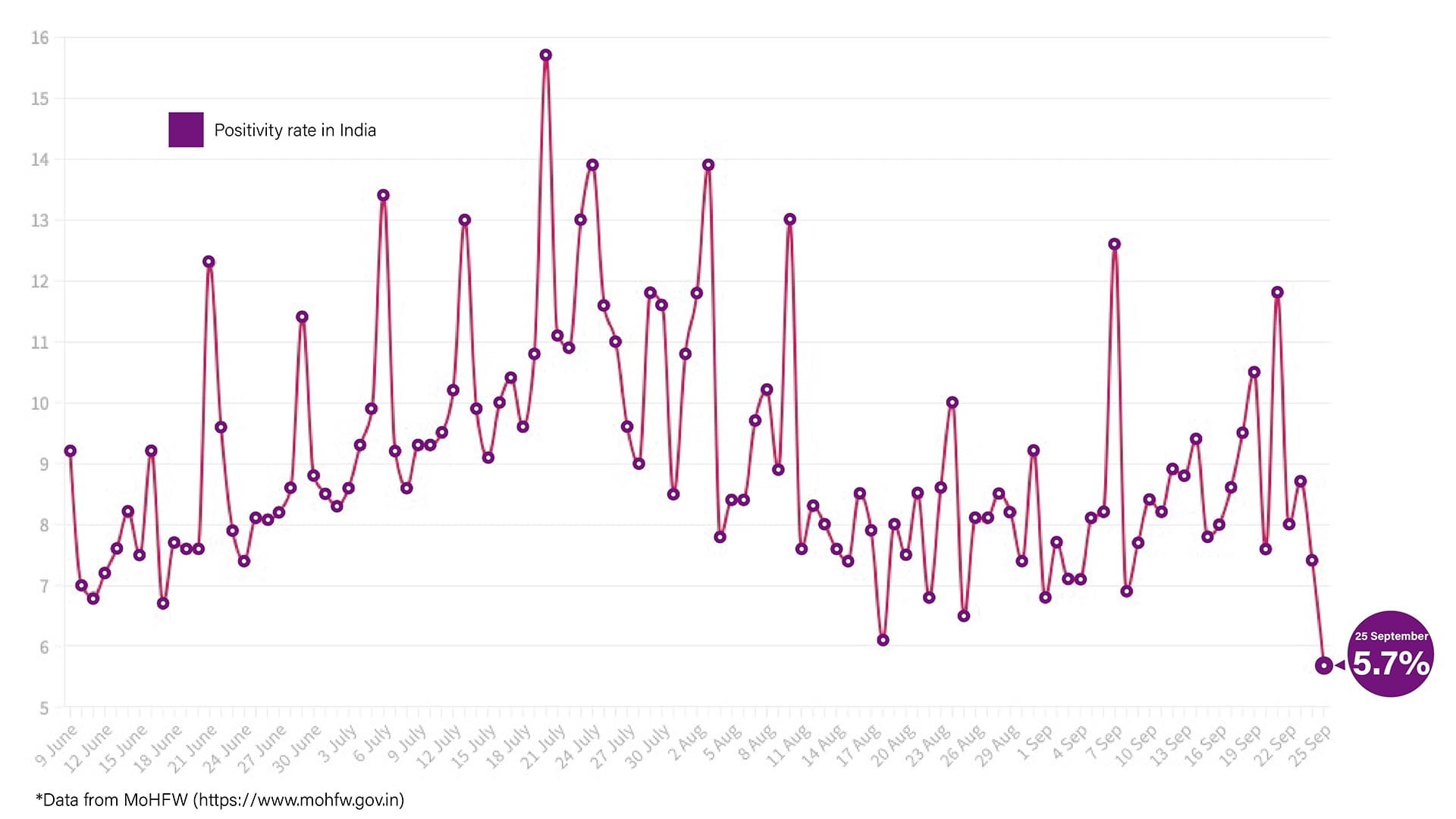 Of the total samples tested in the last 24 hours, just 5.7 per cent were positive. This is the lowest the positivity rate has been in the last four months and is a level that India would want to maintain to build on the gains of the R value finally falling below 1.