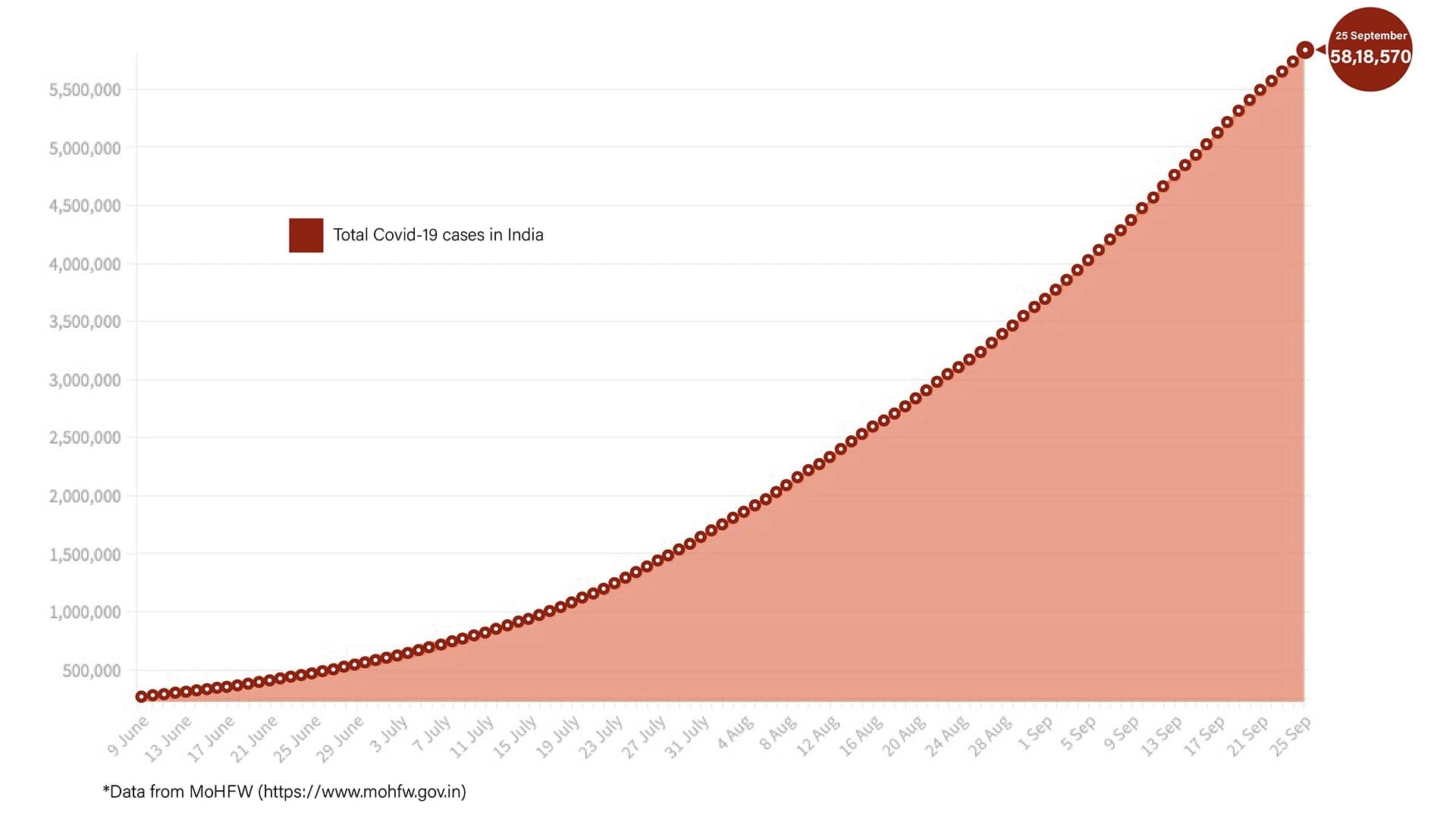 The total number of cases reported in the country till date is 58,18,570. Of these, 86,052 cases were reported in the last 24 hours. So far, India has reported about 4,207 cases per million population, which is among the lowest in the world.