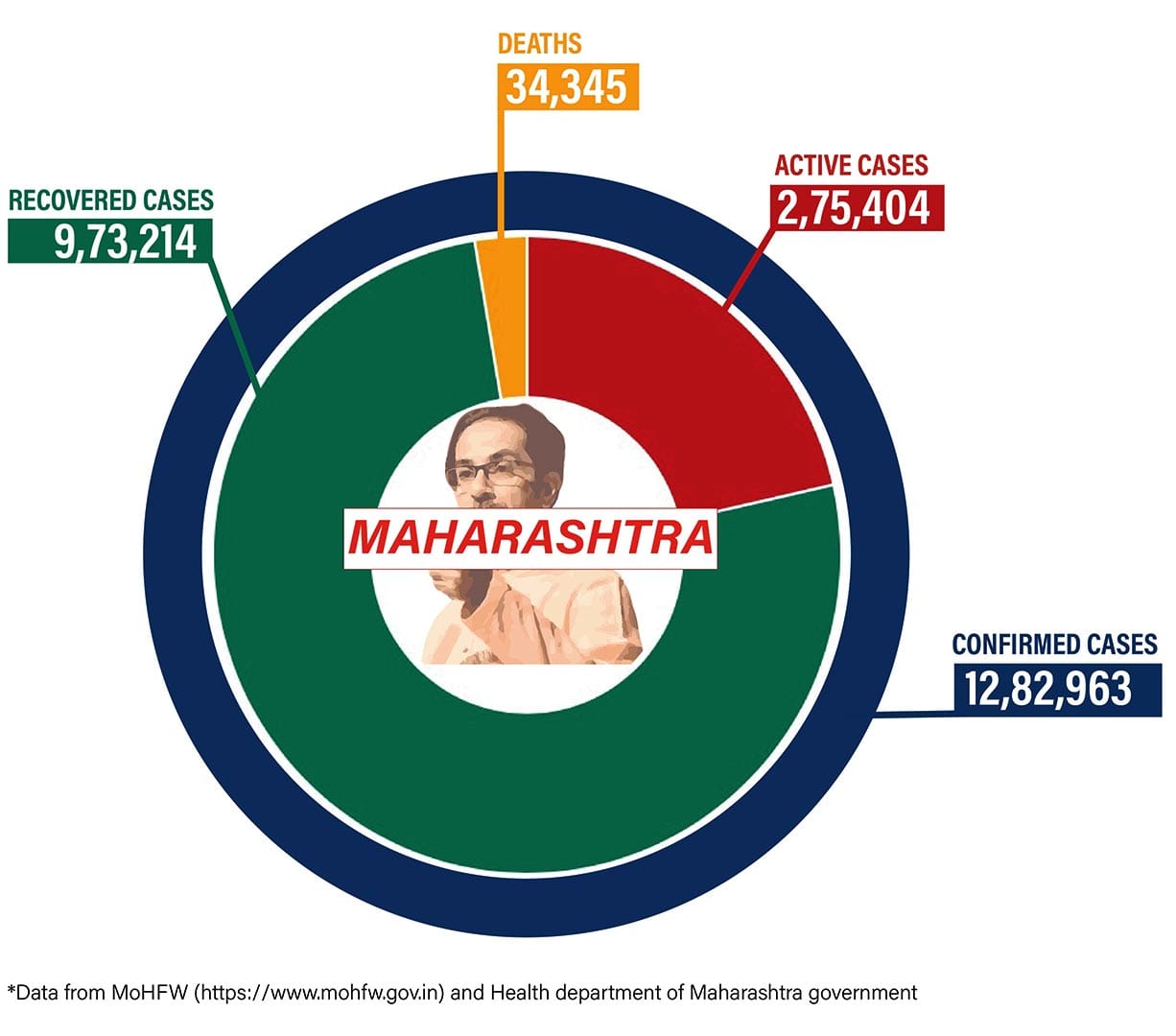Maharashtra reported 19,164 cases in the last 24 hours, along with 484 deaths. The state’s total Covid tally stands at 12,82,963 — the highest in the country. It also shares a little less than a quarter of the total disease burden in India.