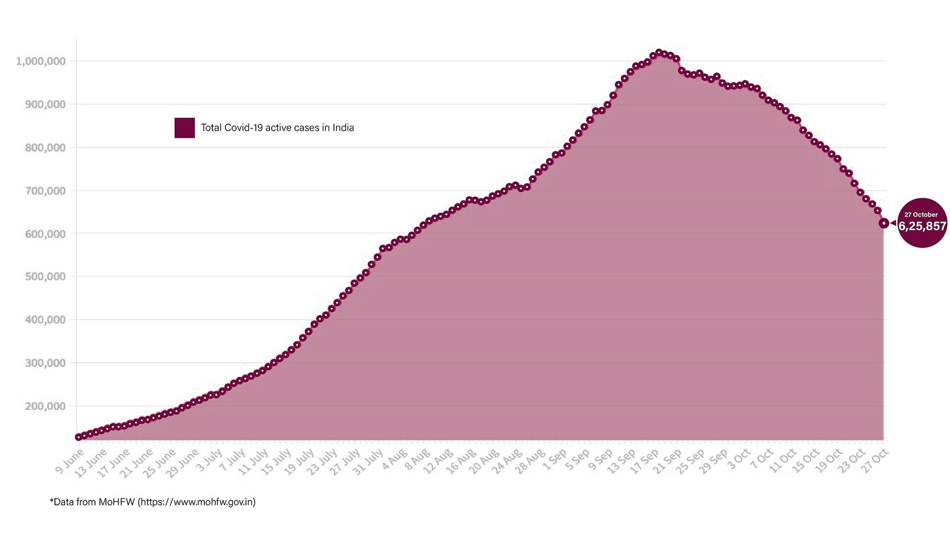 The number of active Covid cases has fallen under the 6.5-lakh mark. The total number of active cases now stands at 6,25,857, which accounts for 7.88 per cent of the total cases detected in the country so far.