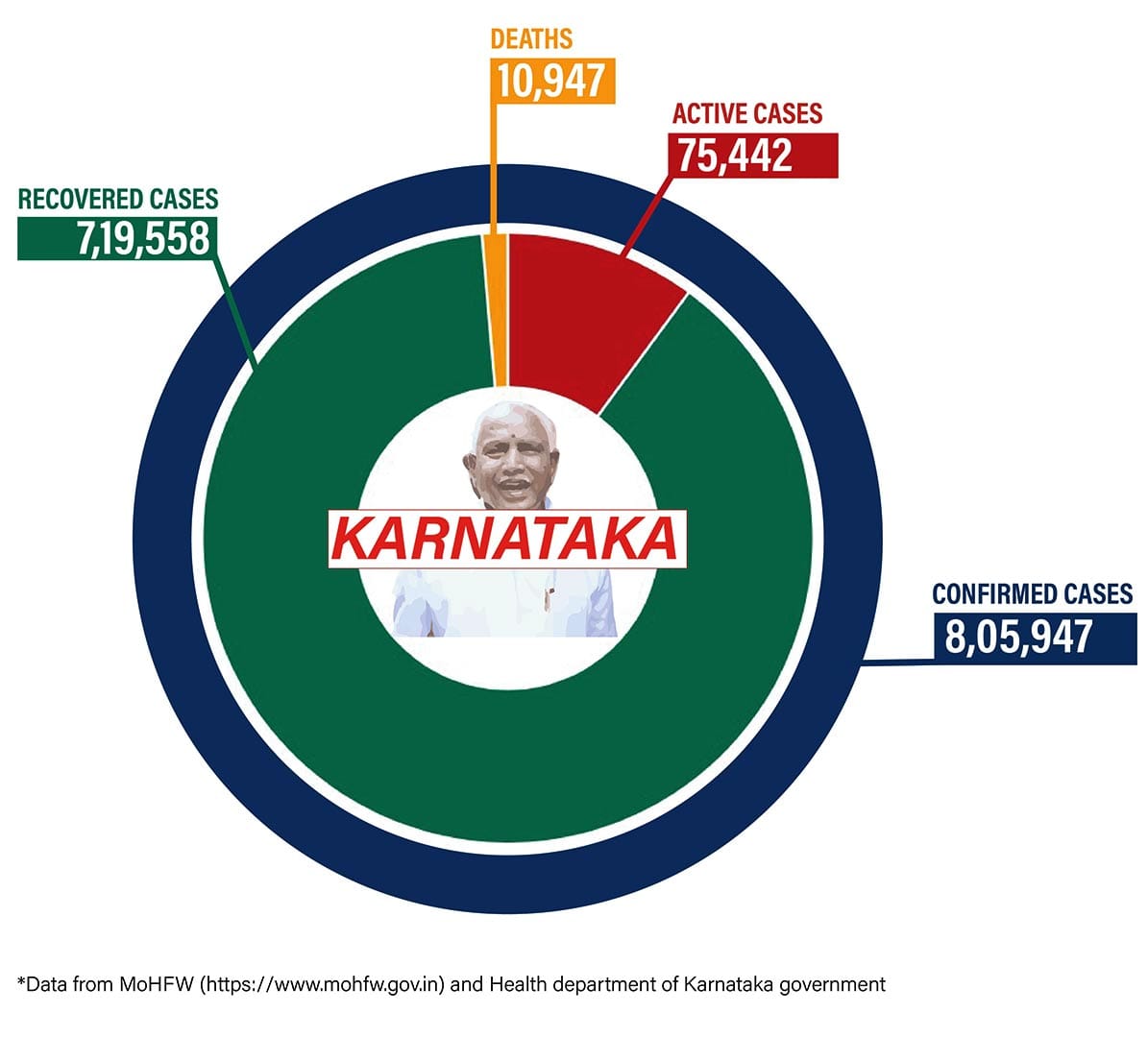Karnataka has reported 8,05,947 cases over the course of the pandemic. Of these, 10,947 people have died, while 75,442 cases are still active.