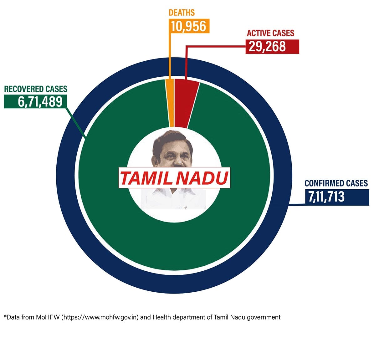 In Tamil Nadu, 2,708 new cases of Covid-19 were reported in the last 24 hours, bringing the total case count in the state to 7,11,713. Of these, 29,268 are active cases.