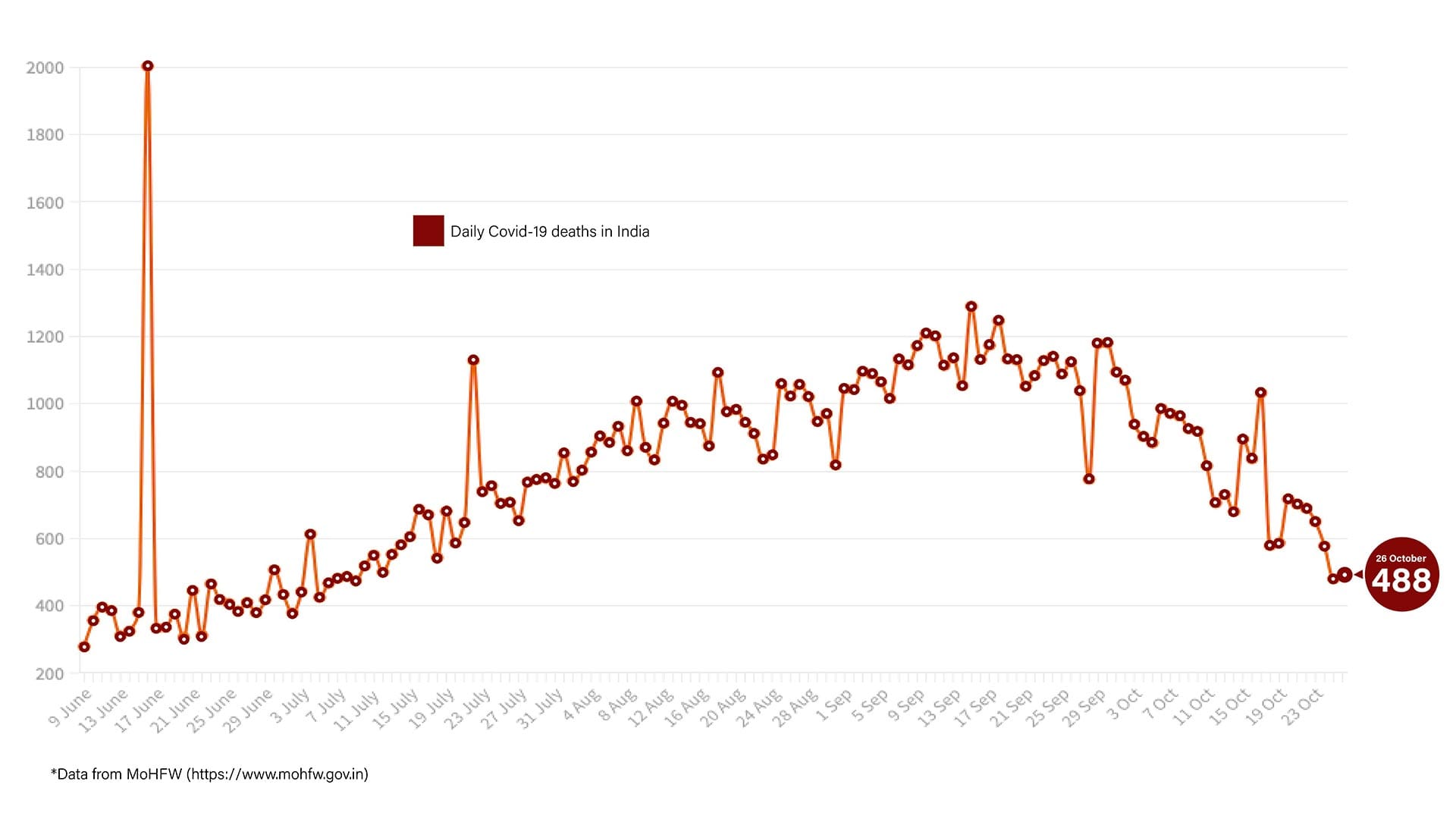 Meanwhile, the number of daily deaths recorded in India remained under 500 for the second consecutive day.