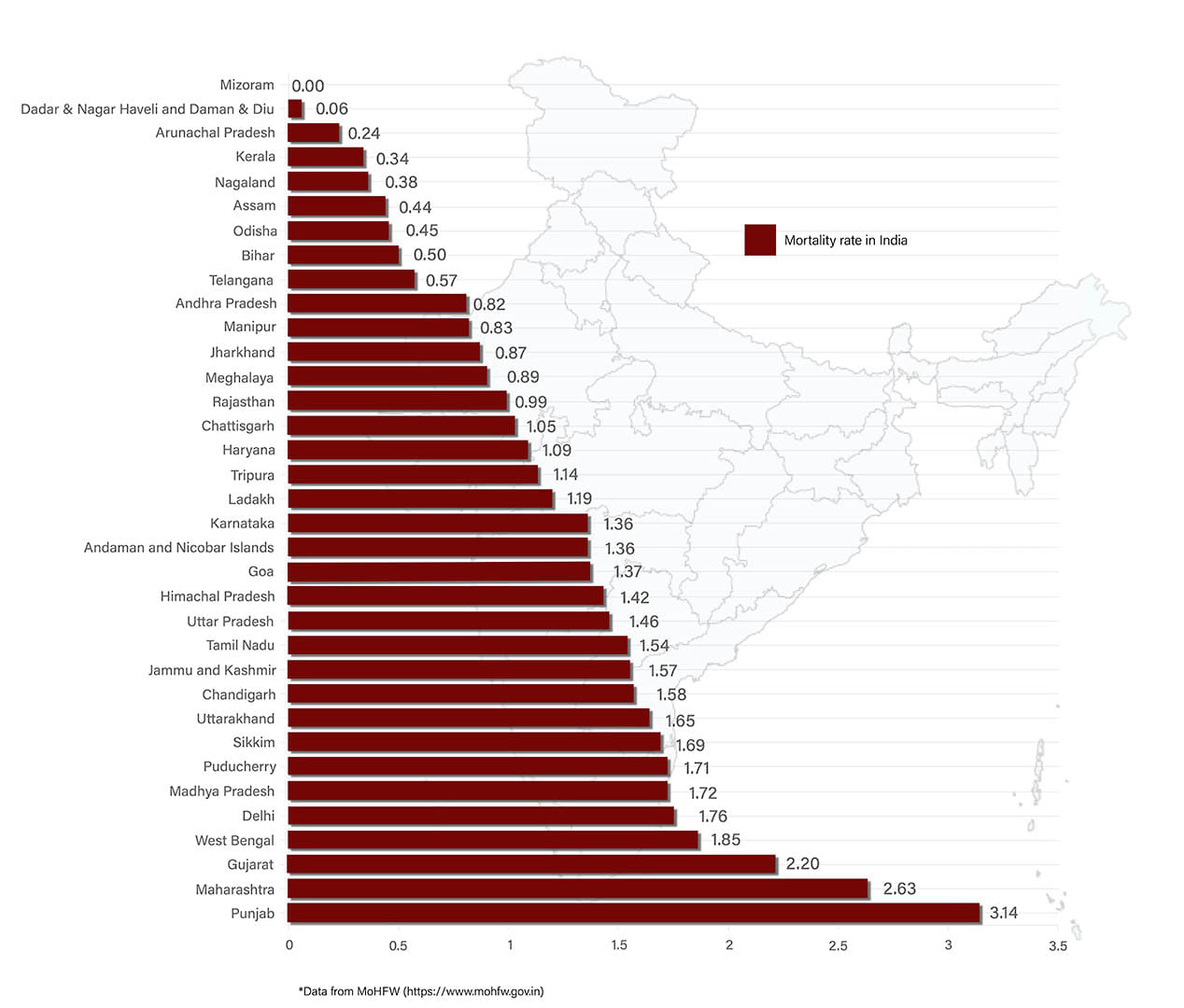 The case fatality rate (CFR) in Punjab remains the highest in the country at 3.14, while the states of Maharashtra and Gujarat are the second and third-worst performing states.
