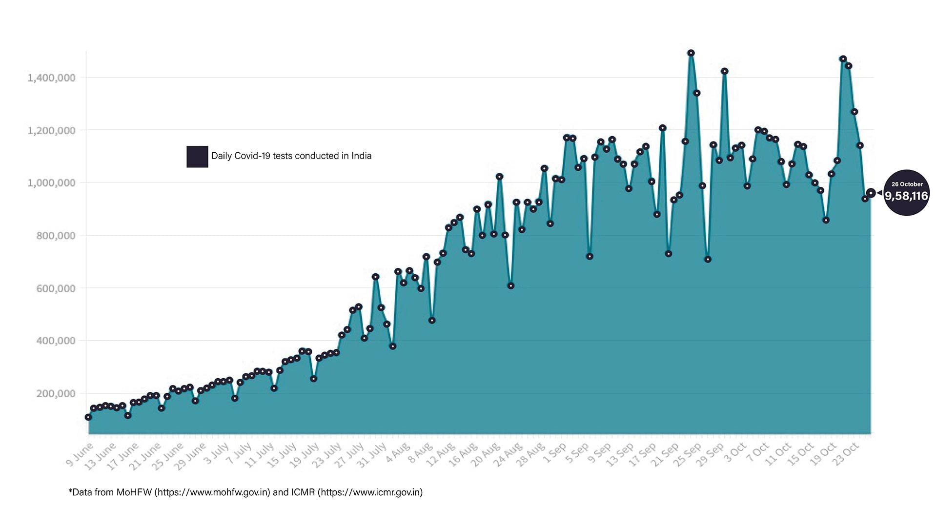 In the past week, the daily testing numbers crossed the 14-lakh mark frequently, however, the daily tests conducted so far have come down considerably. About 9,58,116 Covid tests were conducted across 1,126 government laboratories and 883 private laboratories in the country in the last 24 hours.