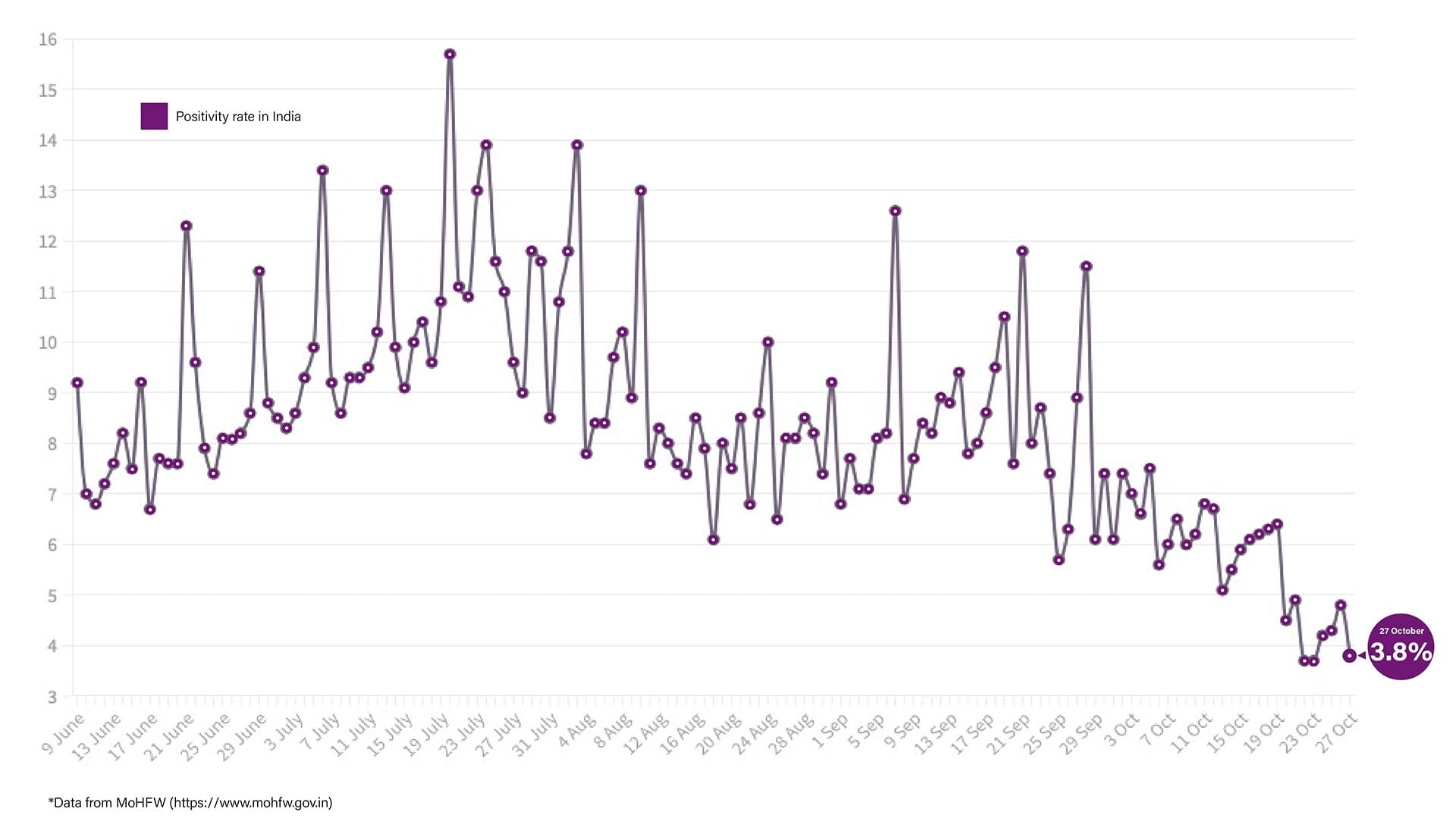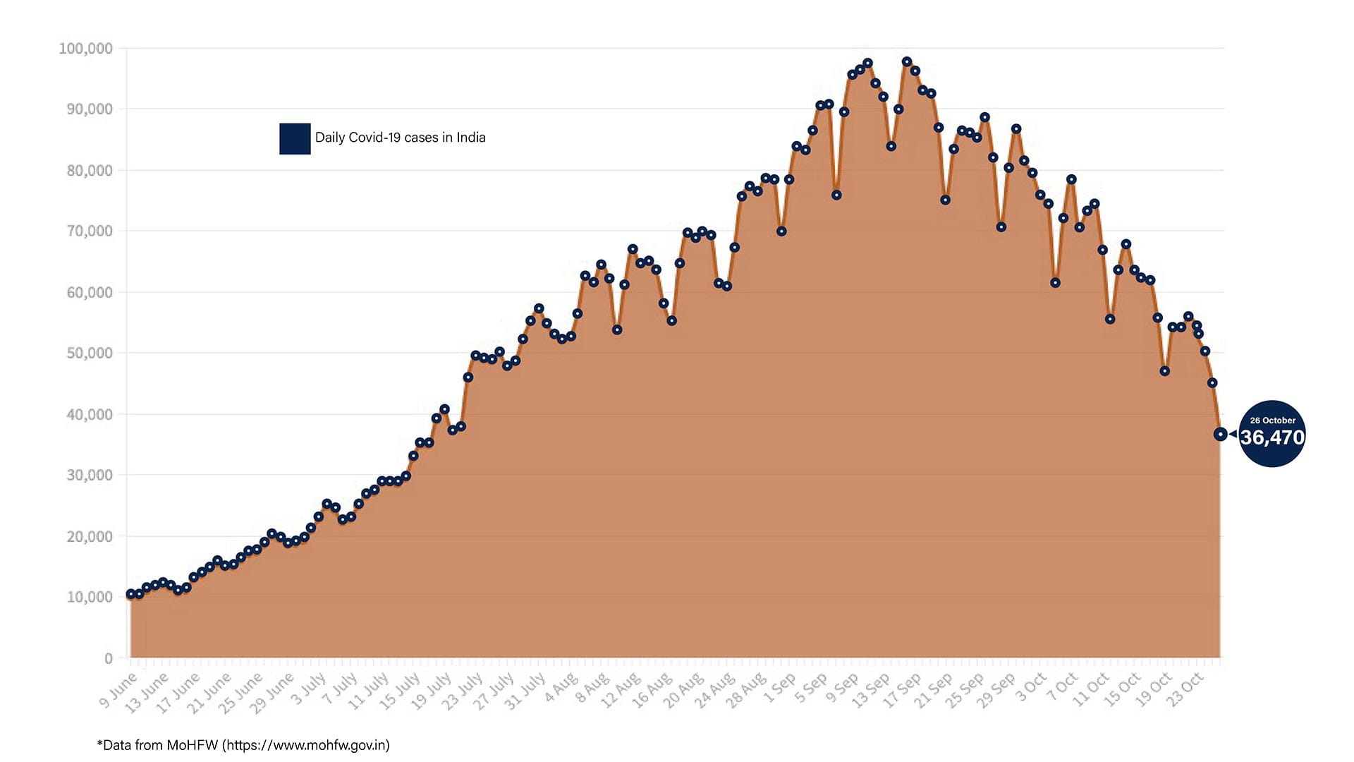 India reported 36,470 new Covid-19 cases in the last 24 hours. This is the lowest number of positives in a single day since 17 July, when India reported 34,884 cases.