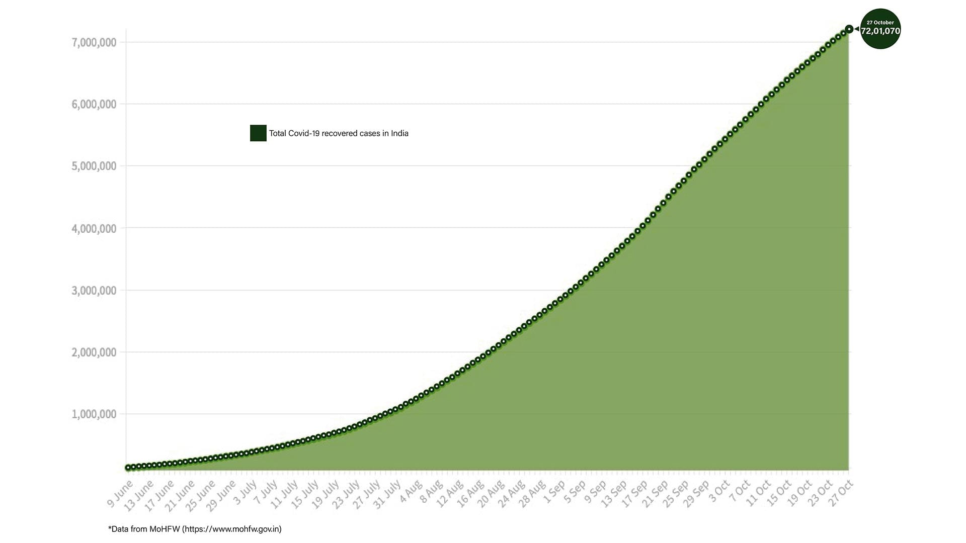 In the last 24 hours, 63,842 people have recovered from Covid-19, bringing the total number of recoveries to 72,01,070.