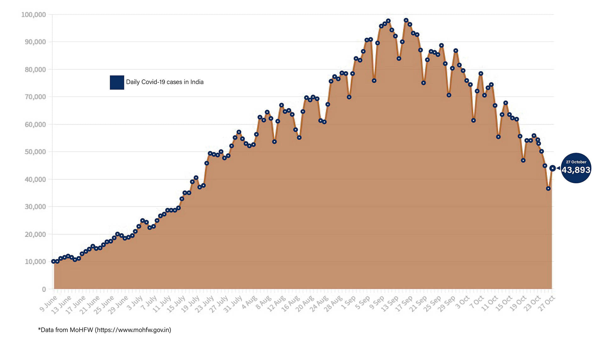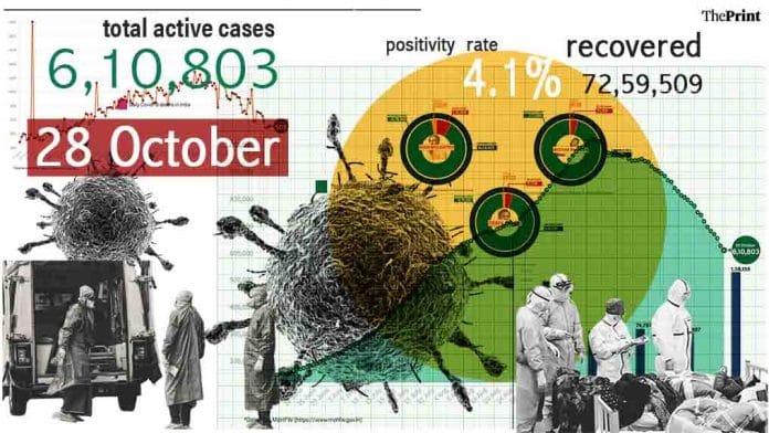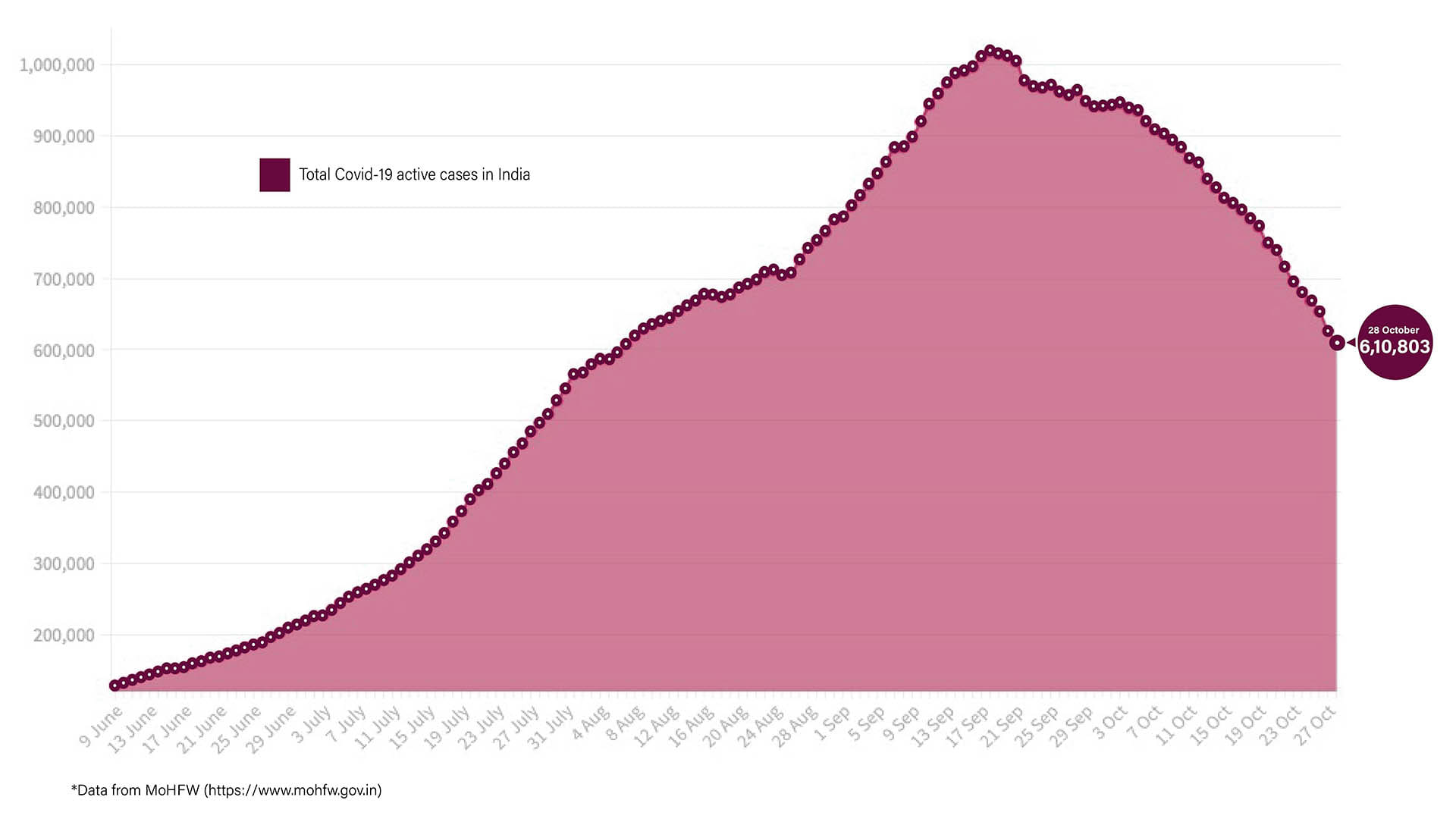 The number of active Covid cases fell further to 6,10,803, which accounts for 7.64 per cent of the total cases detected in the country so far. The number of active cases have been reducing since mid-September.